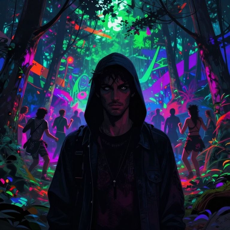 Saturation an illustration of a rave in a forest, dark figure looking at you, many people dancing, acid trip,