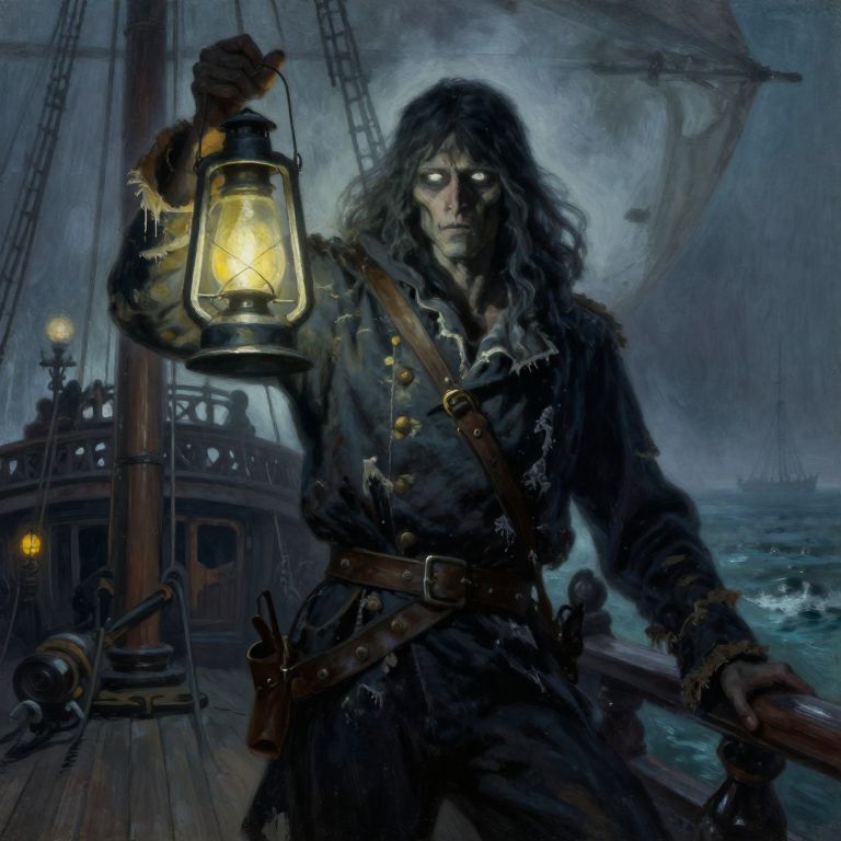 Digital fantasy artwork depicting a rugged, long-haired pirate with glowing white eyes, dressed in a tattered, dark brown coat with brass buttons, and leather straps. He holds a glowing lantern in his right hand, illuminating his intense expression. His left hand grips a ship's railing on a stormy night, with a wooden ship in the background and dark, choppy sea beneath. The sky is cloudy and ominous, adding to the eerie atmosphere. The pirate's shadowy appearance and the lantern's warm light contrast sharply with the cold blue hues of the night.