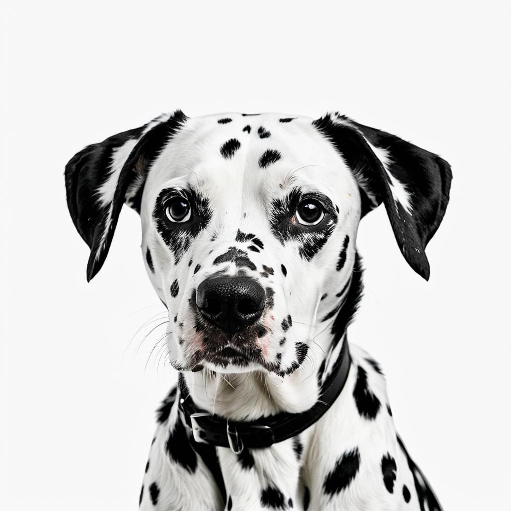 Close-up portrait of a Dalmatian dog with a black and white spotted coat against a clean white background. The dog has expressive dark eyes, a black nose, and is wearing a black collar. The fur texture is realistic with subtle shadows highlighting the coat pattern.