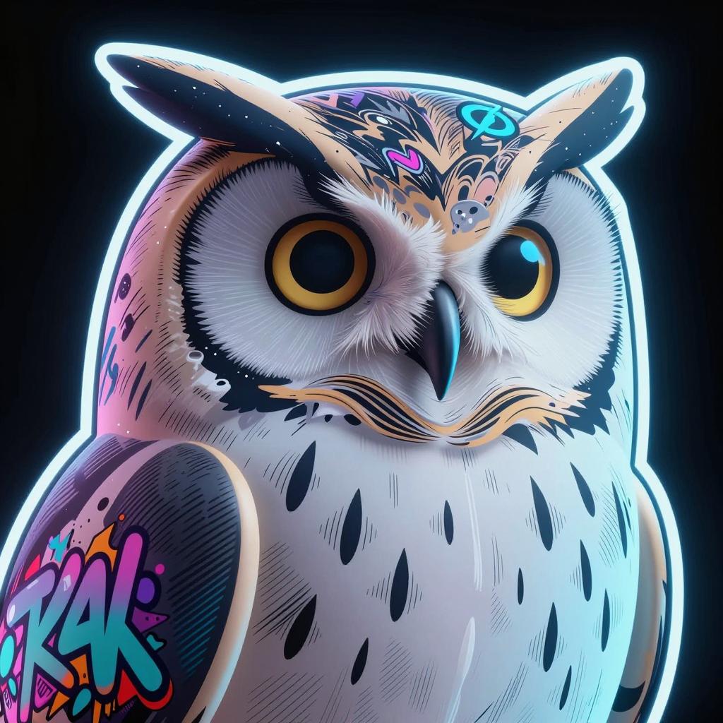 Digital close-up artwork of a fantasy owl blending cyberpunk and anime styles. The design features detailed feathers with graffiti accents and intricate textures, highlighted by a dynamic blue-halogen backlight. Rendered with crisp line art and comics-style inking, the owl is set against a pastel gradient backdrop with a black background, emphasizing its sharp and vibrant details.