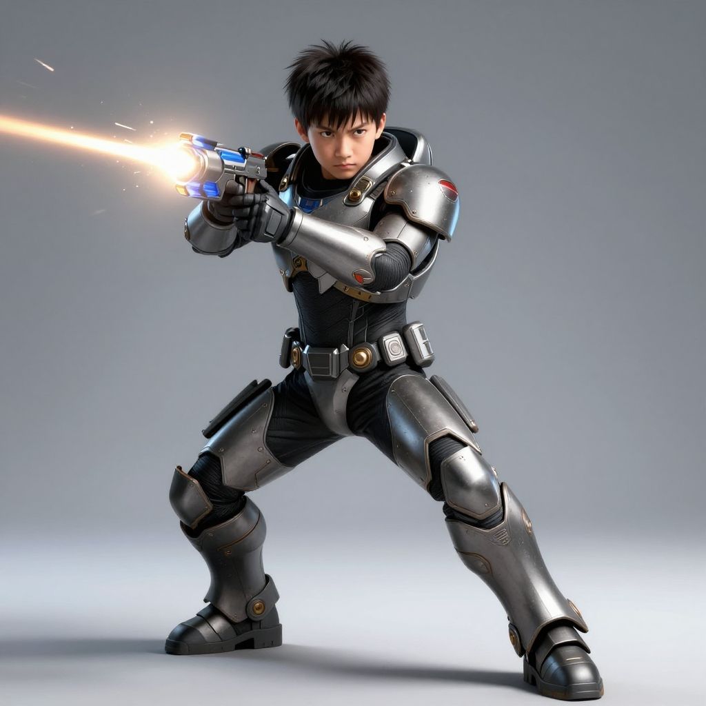 Digital artwork of an Asian male character in futuristic black armor, standing in a dynamic shooting stance. He has short, spiky black hair and intense expression. His right arm is extended forward, firing a glowing, blue and orange energy gun. The armor is sleek with metallic plates and various mechanical details. The background is a simple gradient from light gray to white. The character's stance is low and wide, emphasizing readiness and action. The overall style is highly detailed and realistic, with a focus on sci-fi elements.