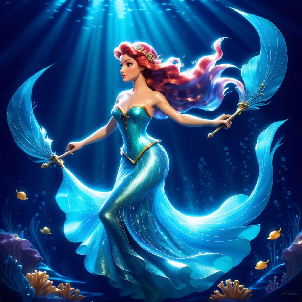 Fantasy character illustration of a mermaid bard in The Little Mermaid by Glen Keane, Claire Keane. Styled with cinematic lighting and high detail.