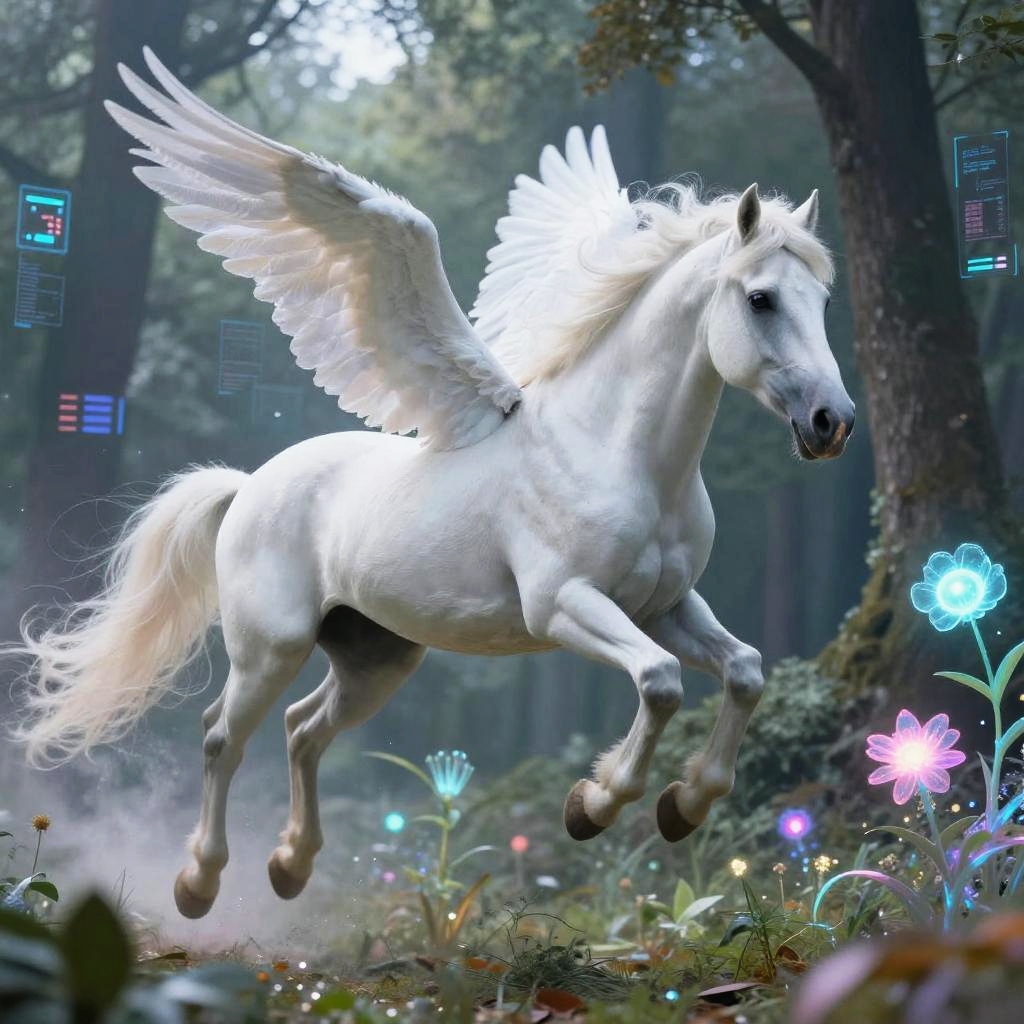 Vapehorse, an ethereal white horse with vaporous wings, flying over a cyber forest with glowing bioluminescent plants, soft pastel colors mixed with neon highlights, magical realism and fantasy fusion.