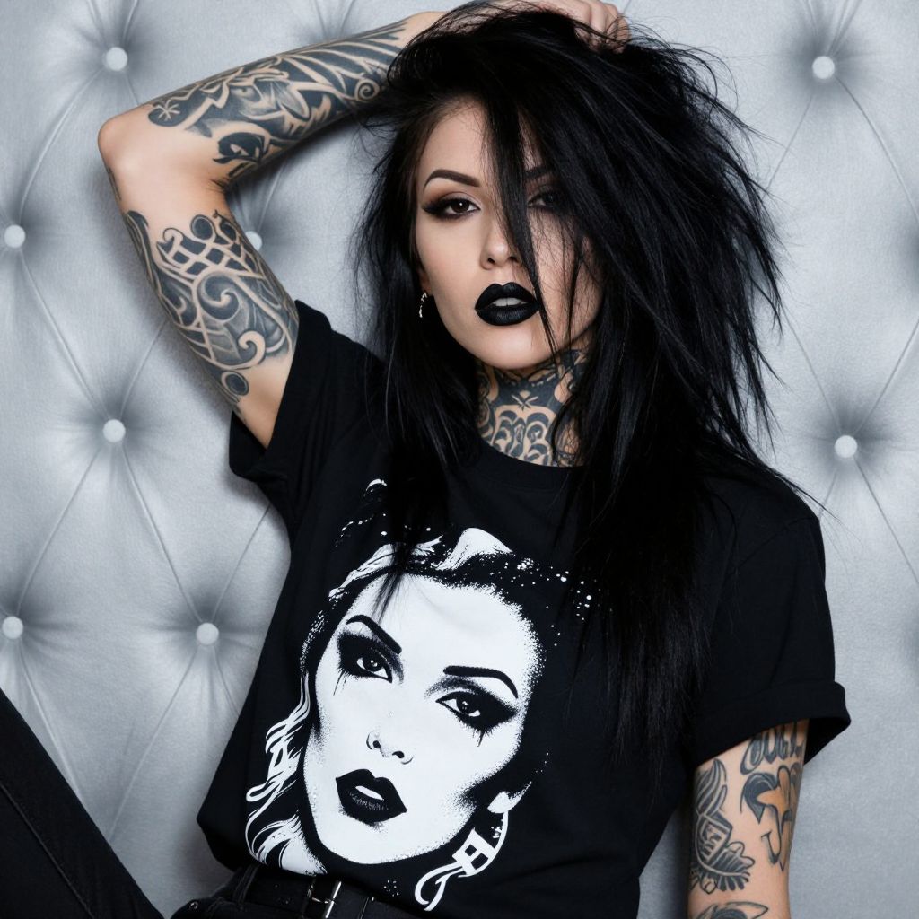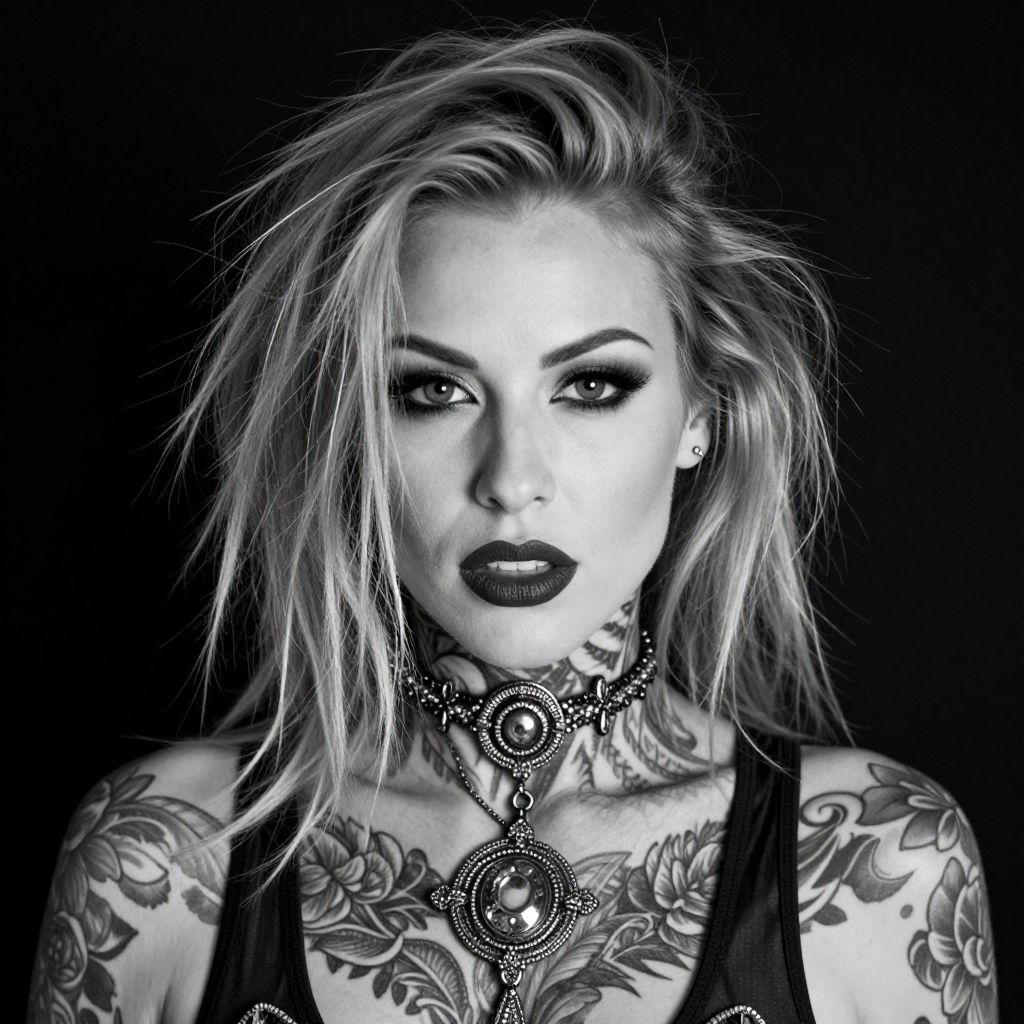 Photograph of a punk-style woman with light blonde hair and dark roots, standing against a gray, textured background. She's wearing a black t-shirt with a skull and bat graphic, and has numerous tattoos on her arms and neck. Her right arm is raised, hand resting on her head, showing off her tattoos. Her makeup is dark and dramatic, with intense eye shadow. She looks directly at the camera with a serious expression.