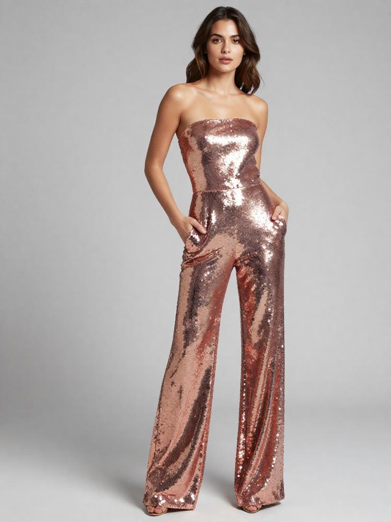 Rose-Gold Strapless Sequin Wide-Leg Jumpsuit