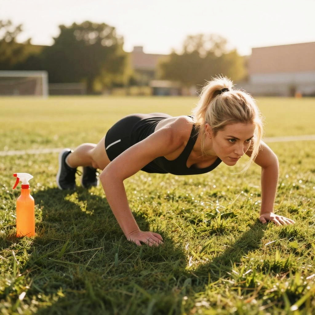 Photograph of a fit, young woman with tan skin and brown hair in a ponytail, performing a plank exercise. She's wearing a blue sports bra, black leggings, and white sneakers with green accents. A yellow medicine ball is beneath her. She's leaning back on her hands, with her knees bent and feet off the ground, focused and determined. The background is pure white, making her the clear focus.