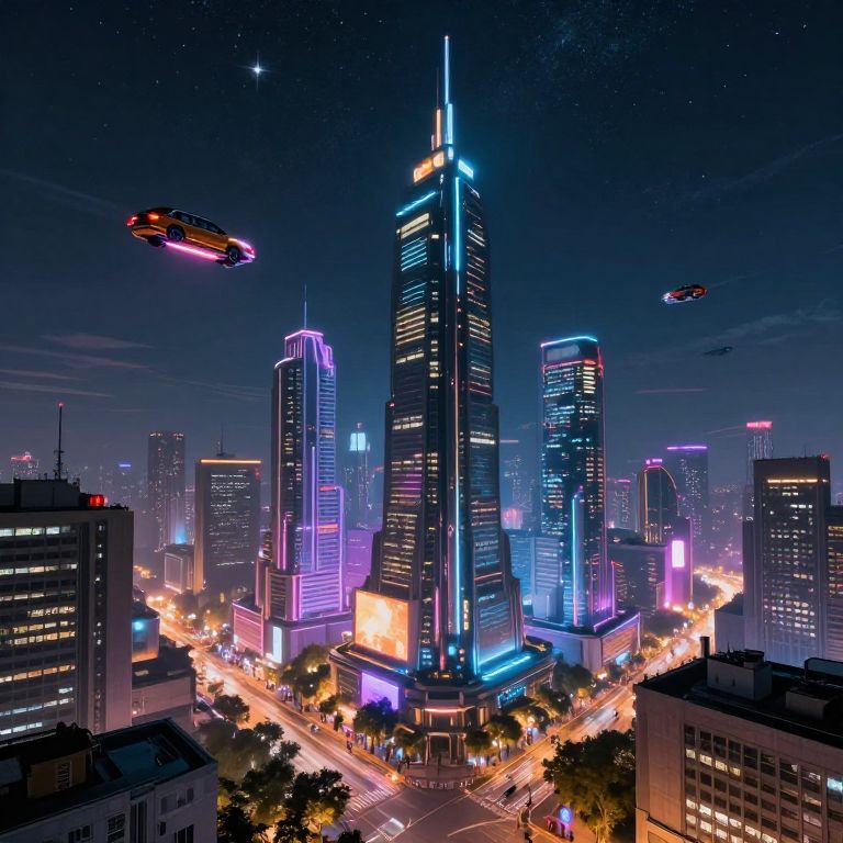 A vibrant, digital CGI illustration of a futuristic cityscape at night. Tall skyscrapers dominate the scene, illuminated with neon pink, blue, and purple lights. A central skyscraper with a glowing blue spire stands tallest. The streets below are busy with bright yellow-orange lights from cars and streetlights. Two flying cars, one red and one brown, hover in the starry night sky. Buildings are sleek and modern, with reflective glass surfaces. Trees are faintly visible at street level. The overall atmosphere is cyberpunk, with a blend of futuristic and urban elements.