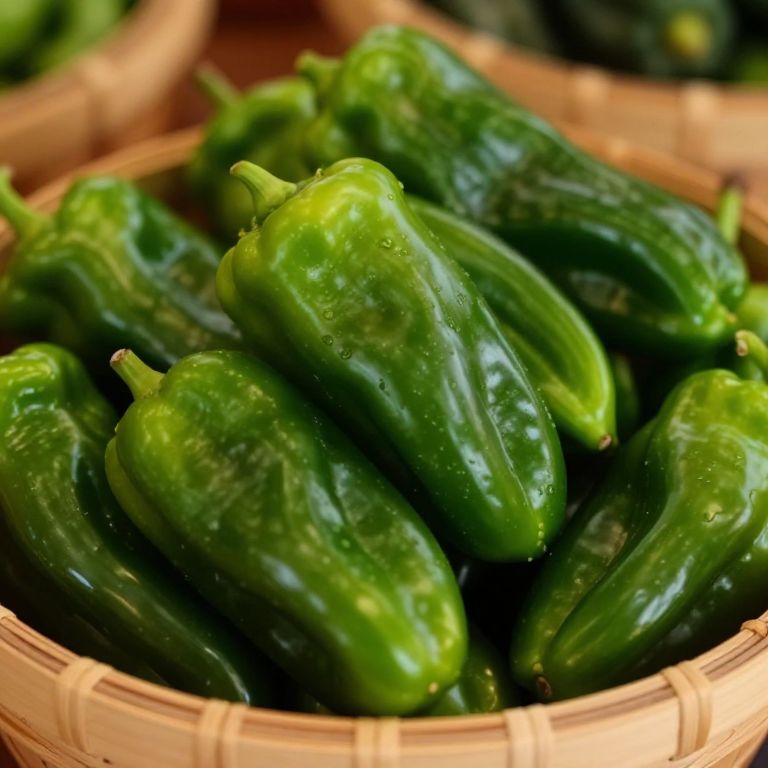 Photograph of fresh, vibrant green chili peppers piled in a woven bamboo basket, with droplets of water glistening on their surfaces.