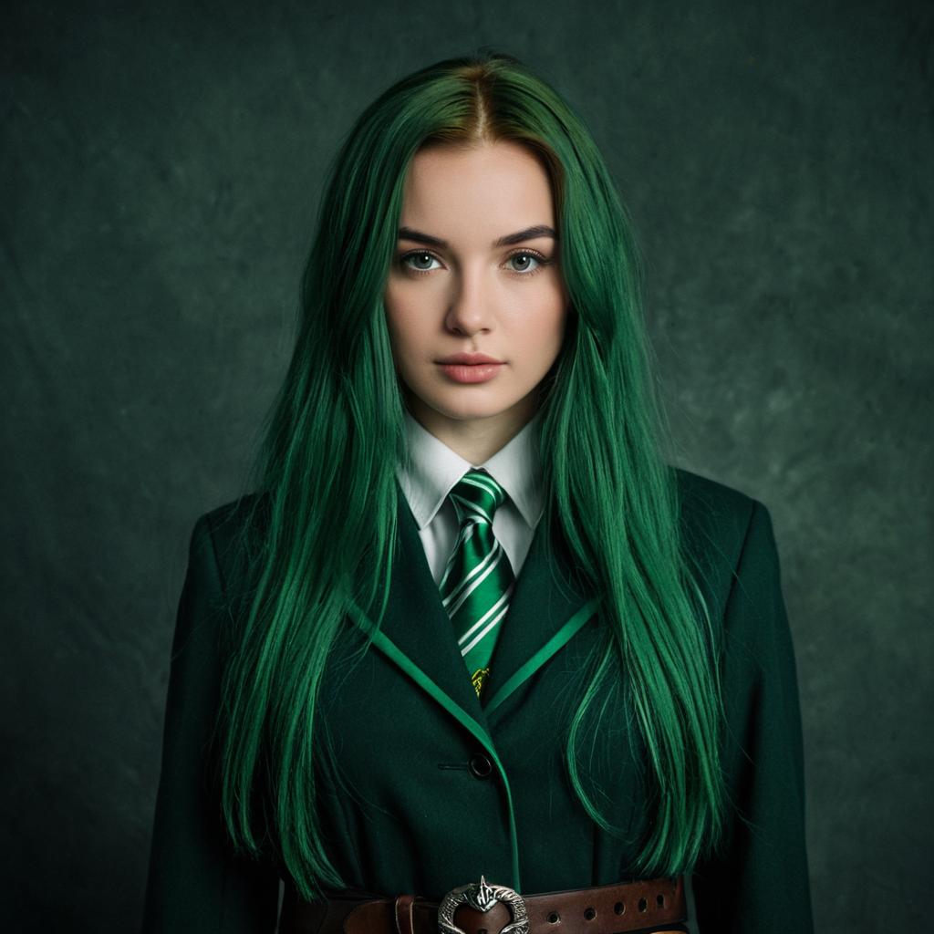 Portrait of a blonde teenage girl wearing a grey school uniform cardigan over a white collared shirt and a red and yellow striped necktie. She has long hair held back with a red headband and wears round glasses. The girl is standing in front of a chalkboard, looking directly at the camera with a neutral expression.