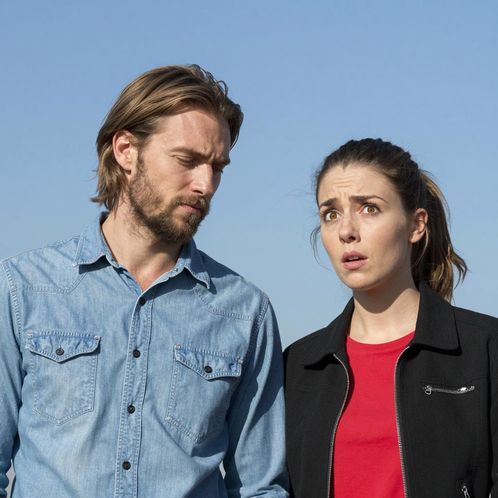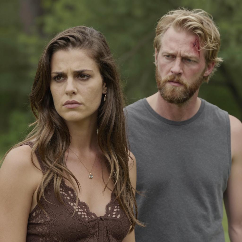 Two people standing outdoors. Woman with long brown hair, wearing a brown lace top, looks serious. Man with blond hair, beard, and a sweat mark on his forehead, wearing a gray sleeveless shirt, looks concerned. Background shows green foliage. Man is slightly behind the woman. Both have intense facial expressions.
