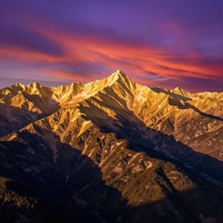 Photograph of a mountain range at sunset, showcasing jagged peaks bathed in golden sunlight. The highest peak is illuminated, casting a warm glow on the surrounding mountains. The sky above features vibrant hues of purple, pink, and red, with streaks of clouds adding depth. The lower mountains and valleys are in shadow, creating a stark contrast with the illuminated peaks. The foreground consists of dark, forested slopes, adding texture to the scene. The overall composition highlights the dramatic interplay of light and shadow, emphasizing the rugged beauty of the mountains.