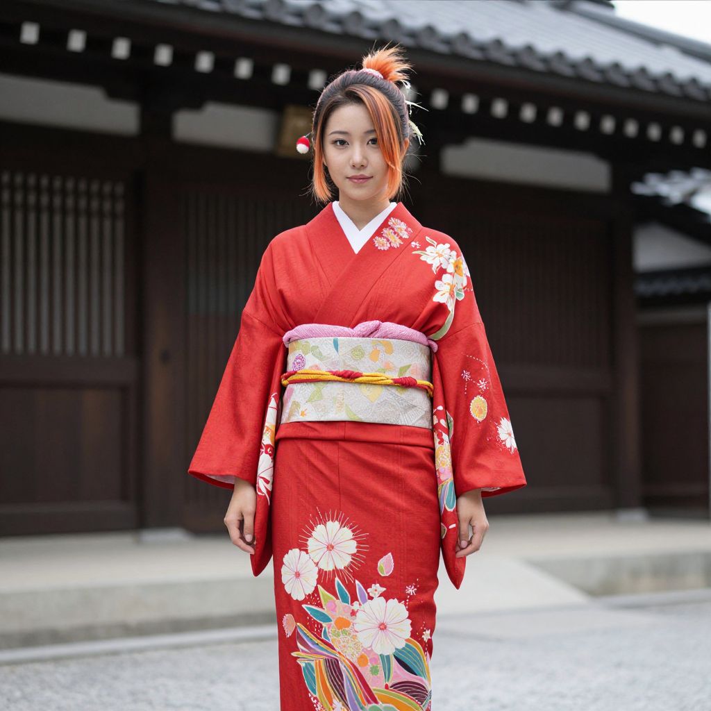 Photograph of an Asian woman in a vibrant red floral kimono with orange hairpin, standing in front of traditional Japanese wooden building.