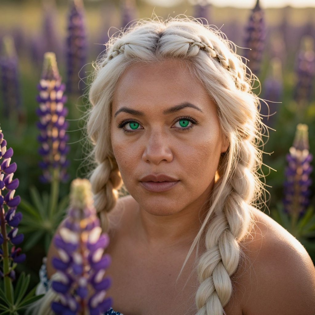 Photograph of a blonde woman with green eyes, braided hair, and fair skin, standing in a field of purple lupines, sunlight illuminating