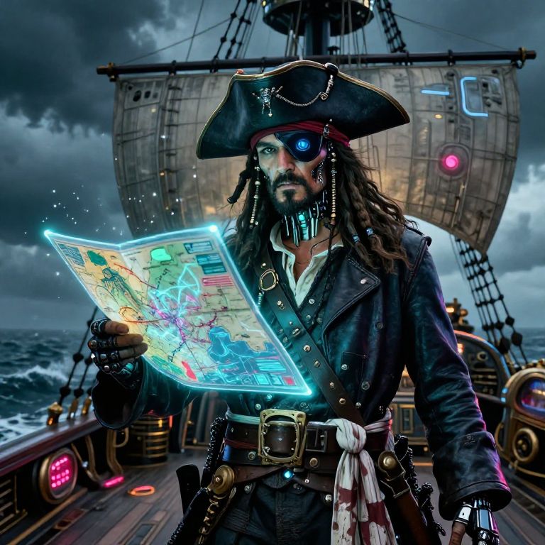 AI pirate standing on the deck of a futuristic ship, blending high-tech machinery with traditional pirate elements, neon lights glowing on metallic sails, cybernetic eye patch, digital map glowing holographically in hand, stormy ocean background, intense expression.