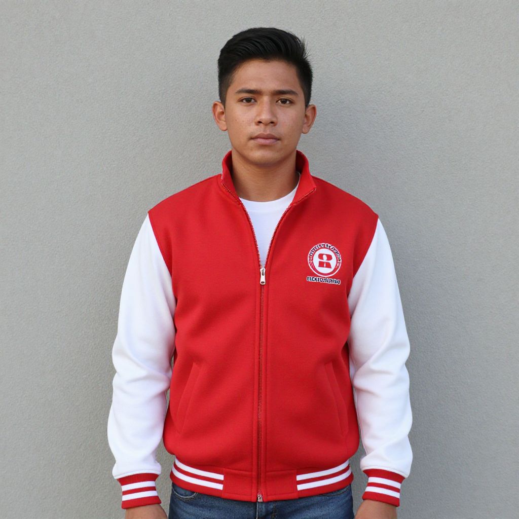 Photograph of a young man with short black hair and medium brown skin standing against a plain, light gray wall. He wears a red and white varsity jacket with white sleeves, red chest and front panel, and red stripes on the cuffs. The jacket has a white circular emblem on the left chest. He also wears a white T-shirt underneath and blue jeans. His expression is neutral, and he looks directly at the camera. The lighting is even, highlighting the vibrant colors of his jacket.