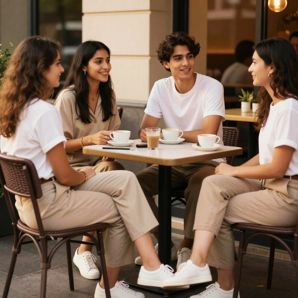 Stylish and neatly dressed group of friends at an outdoor cafe, casual chic outfits with clean lines and matching colors, warm golden hour, candid lifestyle photography style
