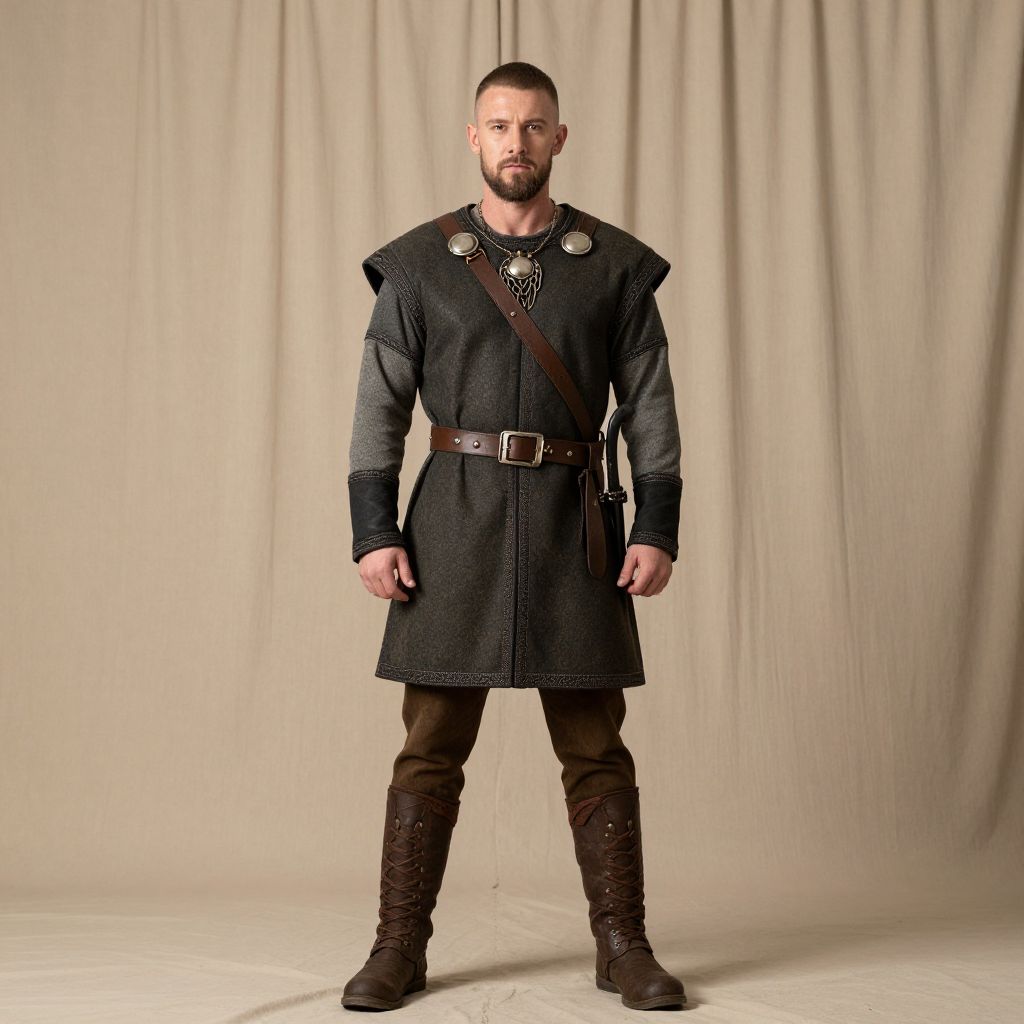 Photograph of a Caucasian man with a trimmed beard and short brown hair, standing against a beige fabric backdrop. He wears a dark grey, medieval-style tunic with shoulder pads, black belt with a brown strap crossing his chest, brown leather boots, and dark brown pants. His tunic has a textured pattern and is cinched at the waist. He has a serious expression and stands with his hands by his sides. The background is plain, with soft lighting highlighting his outfit. The image has a studio-quality finish.