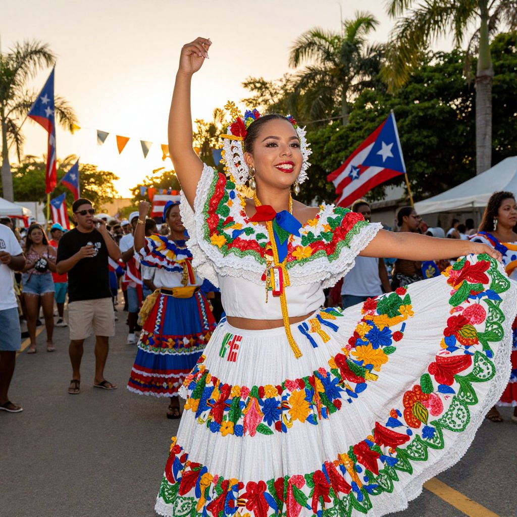 A stunning Puerto Rican festival dancer adorned in elaborate traditional attire that blends vibrant red, white, and green flag colors, dancing energetically in a colorful parade setting under a golden sunset, surrounded by tropical trees and festive flags, with a young woman of Puerto Rican heritage, smooth face, deep brown eyes, and radiant expression, moving gracefully in rhythm to live music.. The woman has big tits and cute face