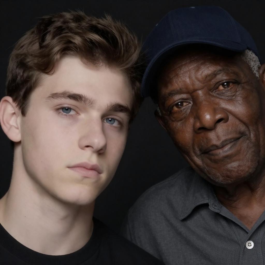 Photograph of two men, close-up, dark background. Young white man with brown hair, serious expression, light skin. Older black man with wrinkled face, slight smile, dark skin, wearing a blue cap and shirt, leaning towards the younger man.