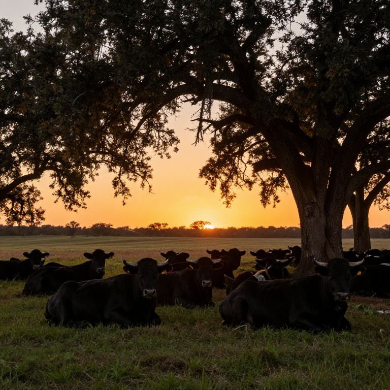 A herd of Toro Brangus cattle resting under large oak trees on a vibrant ranch at sunset, capturing their powerful physique and sleek black coats with warm, moody lighting
