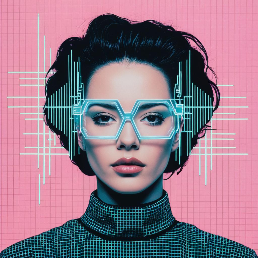 Vaporwave Create a portrait of a synthetic oracle that embodies cybernetic non-binary beauty, technology, and futurism, while pushing the boundaries of traditional aesthetics. Incorporate elements such as retro computer chips, pastel grids. Draw inspiration from James White (Signalnoise), Jean-Michel Basquiat, Marina Abramović.