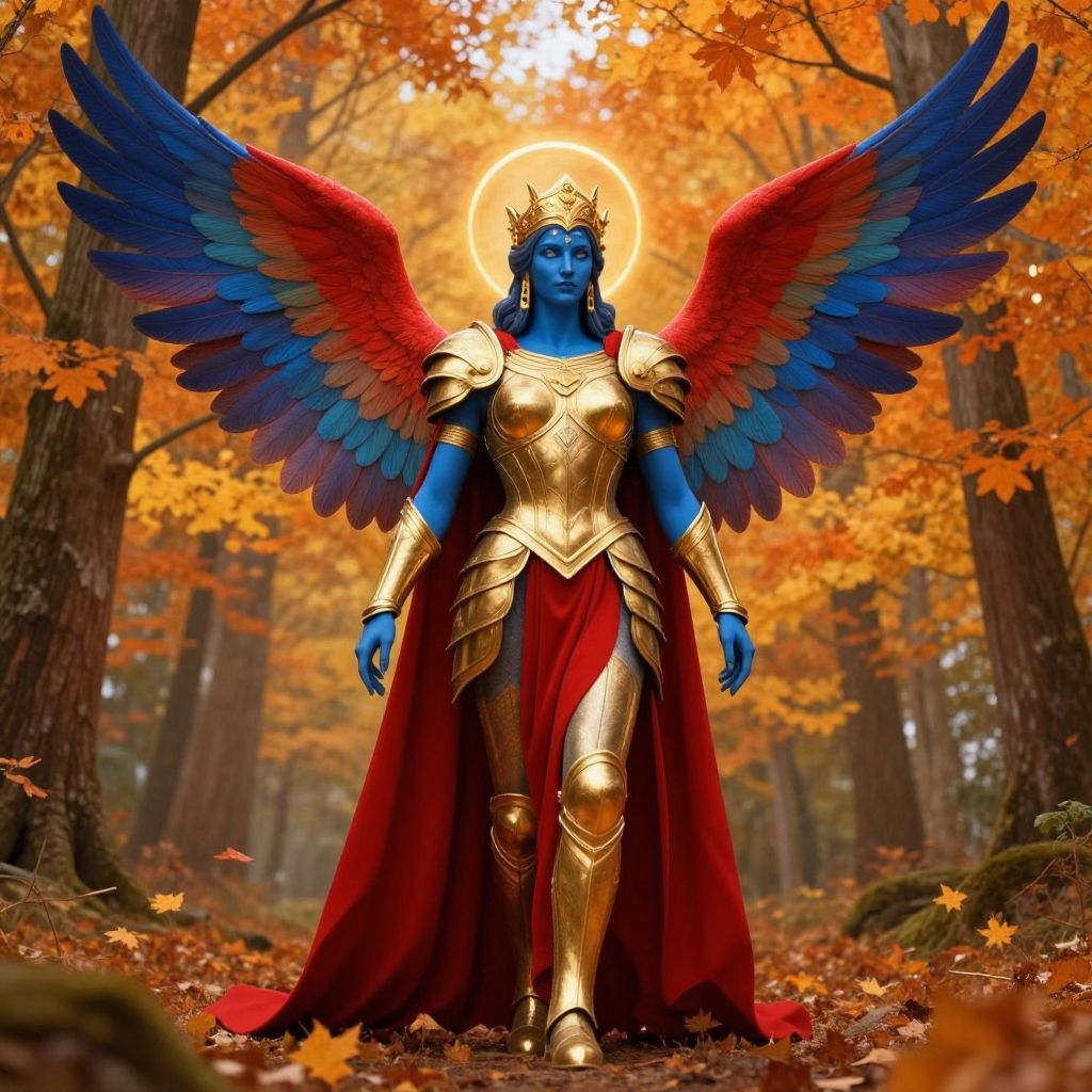 A dreamlike digital artwork depicting a celestial protector with blue skin, adorned in gold armor and a red cape, standing majestically in a vibrant autumn forest. The figure features large, colorful wings blending blue and red feathers, and a golden halo crown, combining anatomical precision with classical elegance. Surrounding trees showcase orange and yellow leaves, highlighting the seasonal ambiance.