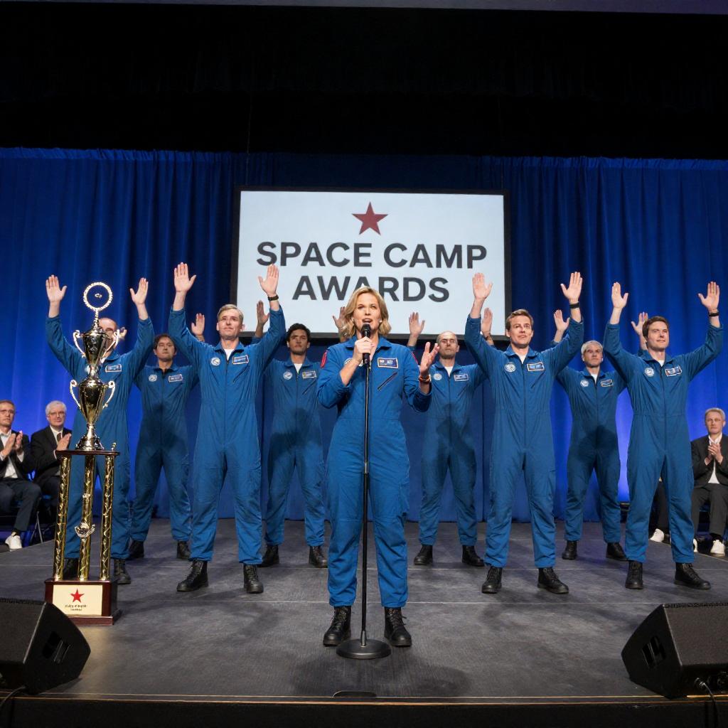 Photograph of eleven astronauts in blue flight suits standing on stage with arms raised. Central woman speaks at microphone. Large trophy on left. Stage has blue curtains and "Space Camp Awards" banner. Audience clapping on left. Nighttime setting.