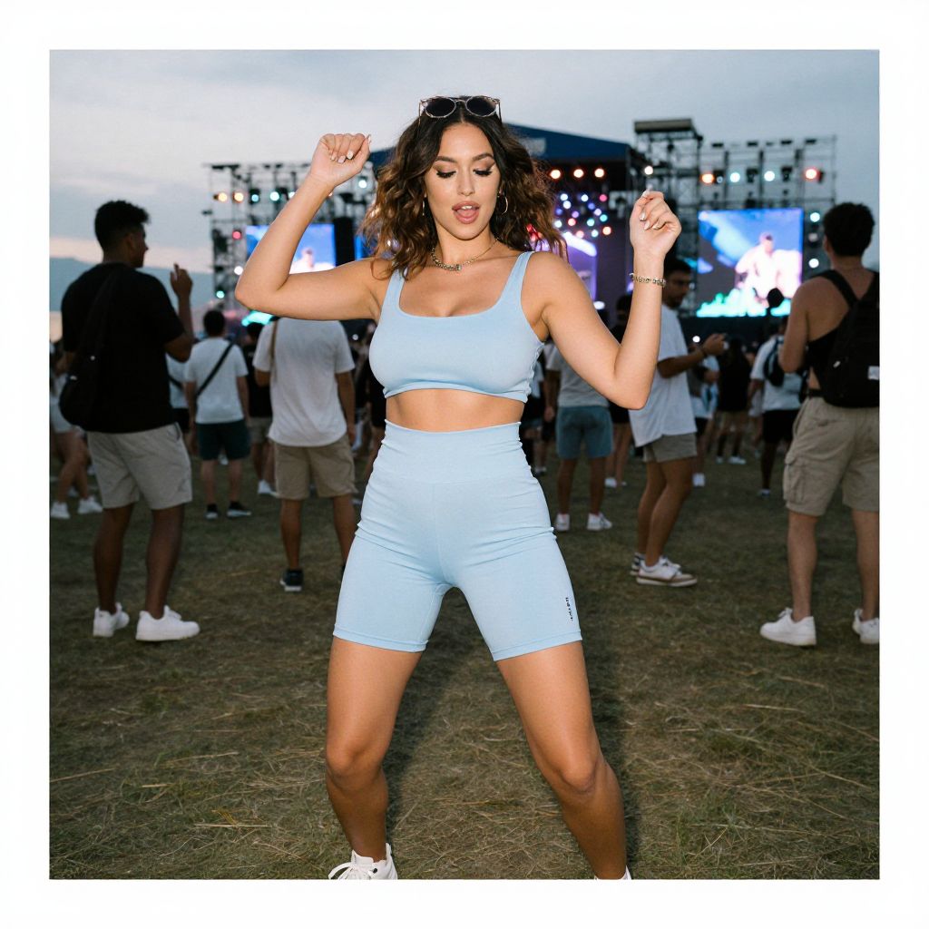 Photograph of a young woman with wavy brown hair dancing in an outdoor festival. She wears a light blue sports bra and high-waisted matching shorts, along with white sneakers. Her eyes are closed, and she has her fists raised near her face. In the background, blurred festival-goers in casual attire and a dark stage with bright lights. The grassy ground is visible beneath her. Her medium build and light tan skin are accentuated by the bright festival lights. Her sunglasses rest on her head. The image has a slight vignette effect.