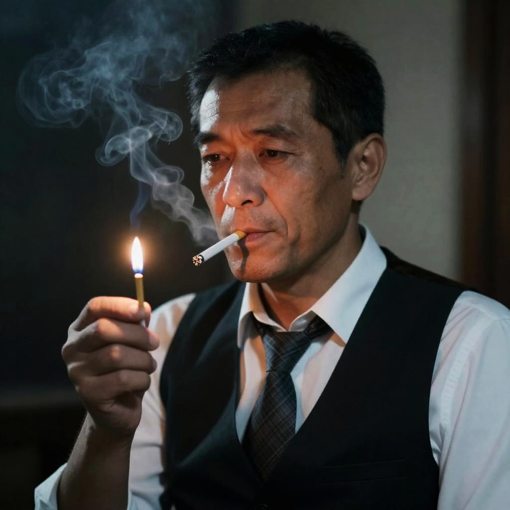Middle-aged man with dark hair, smoking cigarette, holding lighted match, smoke curling around face. Wearing white shirt, black vest, checkered tie. Background is dimly lit, with light source behind him. Intense gaze, slight smile.