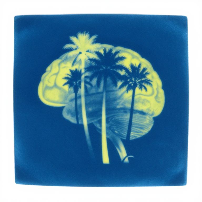 Cyanotype two color flat logo for a hypnotherapist in palm springs california refrence symbology for healing, palm trees, a brain, hypnosis,