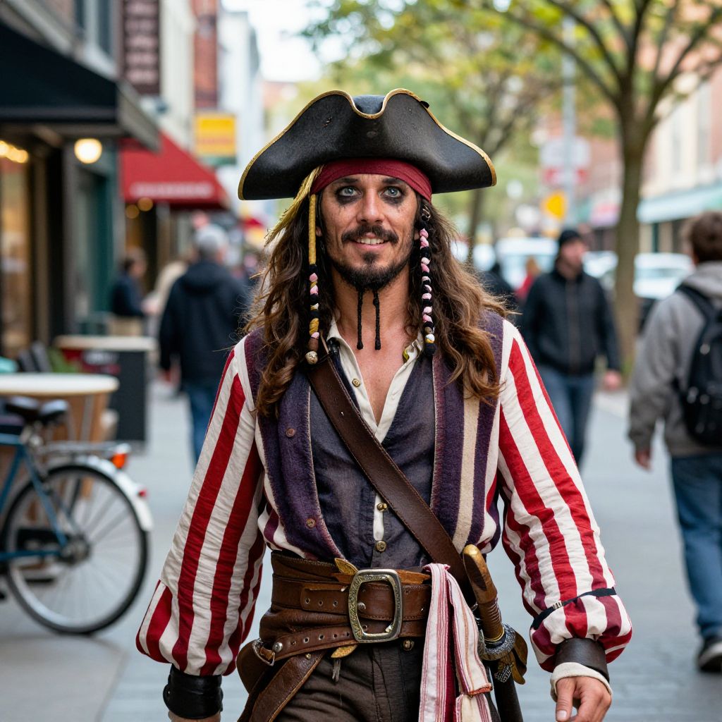 A man in a pirate costume is walking down a bustling city street, wearing a black pirate hat with a golden feather on top, a red and white striped jacket, and a cutlass at his side. He has a weathered face with a rugged beard, bright eyes, and a mischievous smile, as he glances around with a sense of adventure. The street is lined with colorful storefronts, bicycles, and people going about their daily lives, creating a vibrant, realistic urban scene with soft sunlight filtering through the trees in the background.
