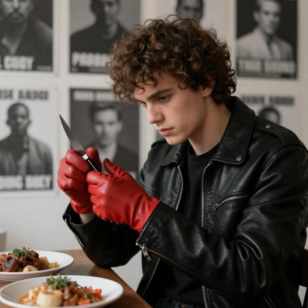 Young man with curly brown hair, wearing a black leather jacket, cuts off his red-gloved right hand. Background: black and white posters. Plates with food on table. Intense expression on his face. One-handed motion. Posters feature various images.
