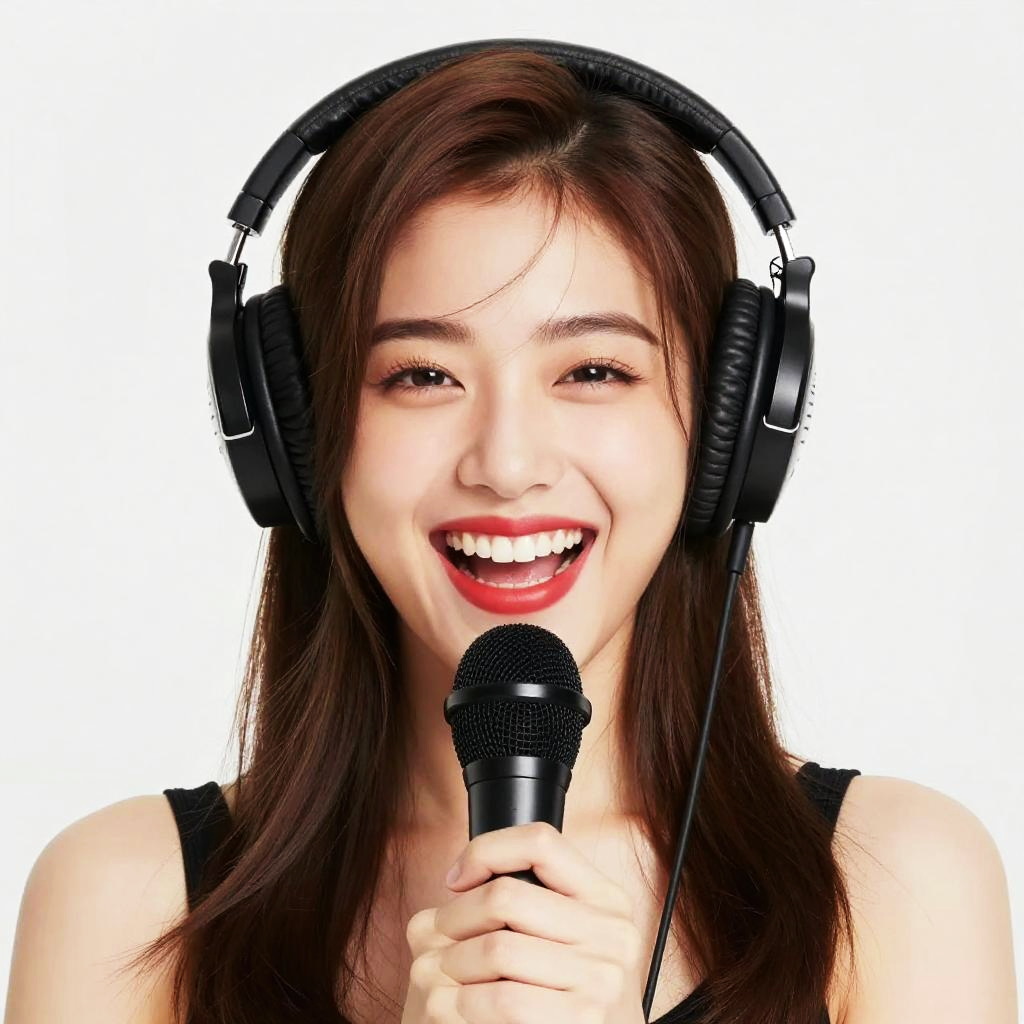 Smiling Young Woman Singing with Headphones