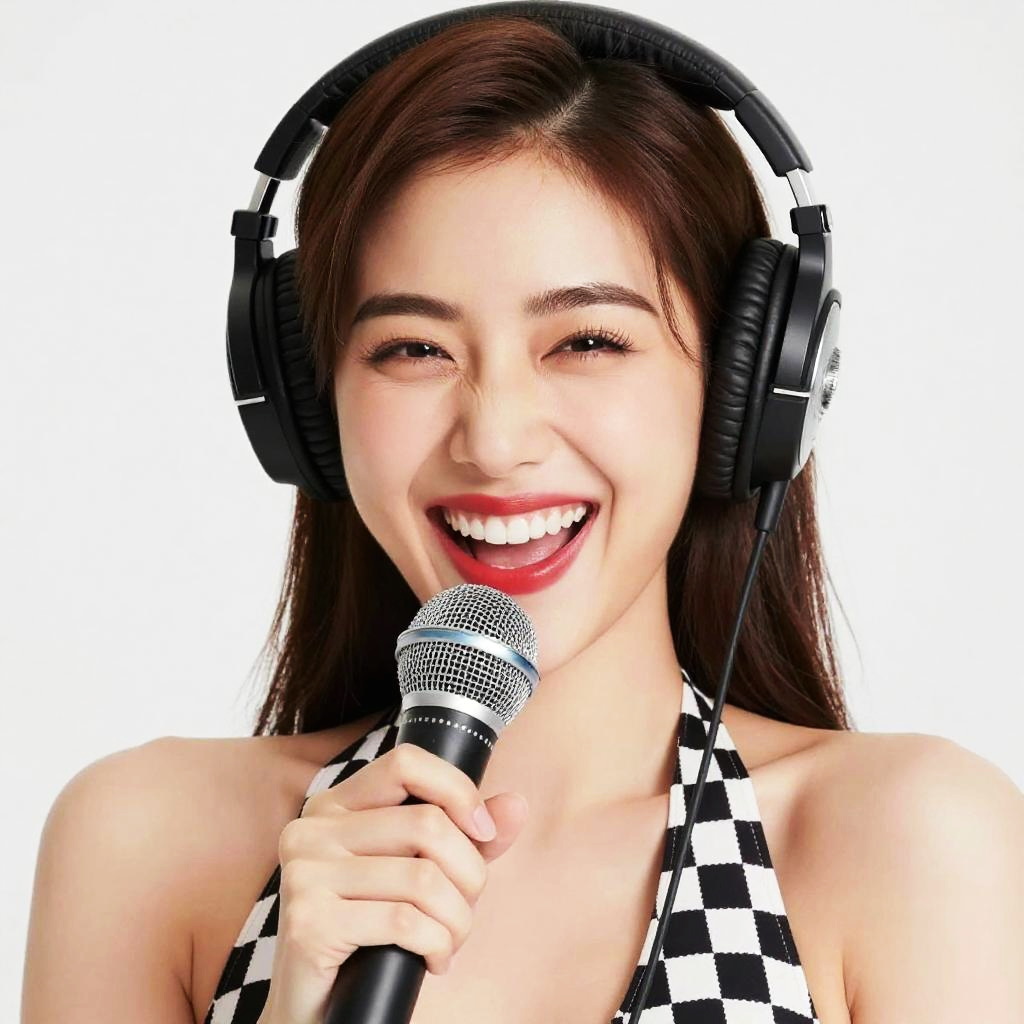Photograph of a smiling young woman with light brown hair and fair skin, wearing large black headphones and holding a microphone close to her slightly open mouth. She has light makeup, including pink lipstick, and is wearing a black and white patterned top. The background is bright white, making her the clear focus of the image. Her eyes are closed, and she appears to be enjoying the music.