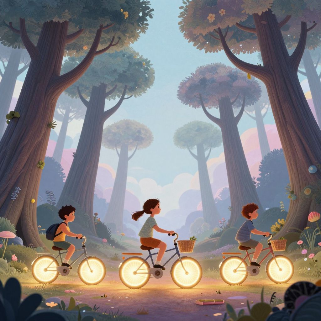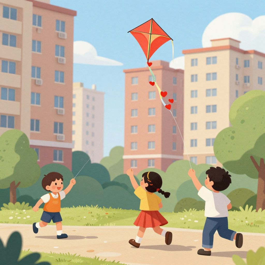 In a whimsical digital illustration, children joyfully ride oversized acorns floating upside-down against a vibrant urban backdrop, defying gravity as they race through a sky dotted with clouds and illuminated by a dreamy, golden-hour light, with trees growing roots upward toward the stars.
