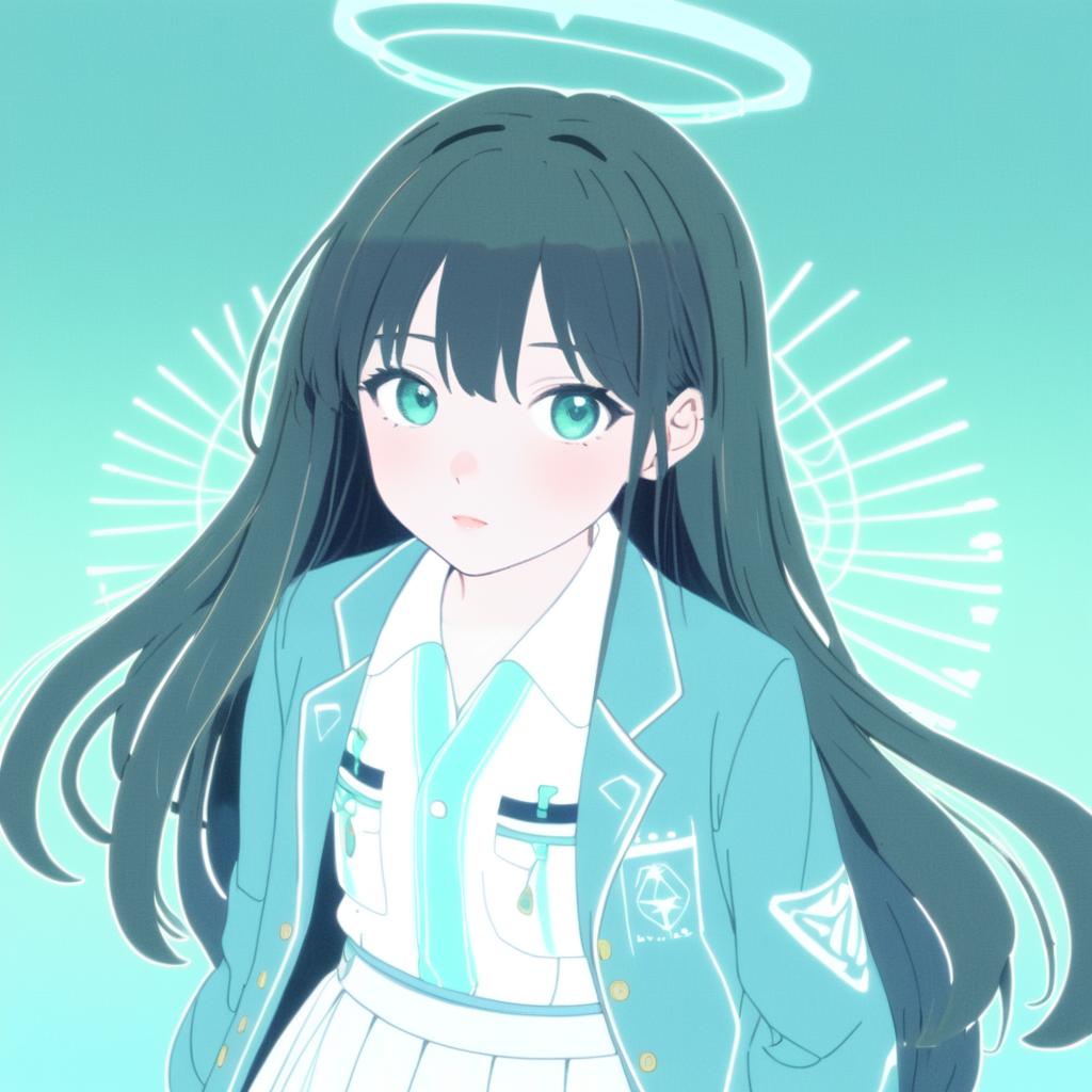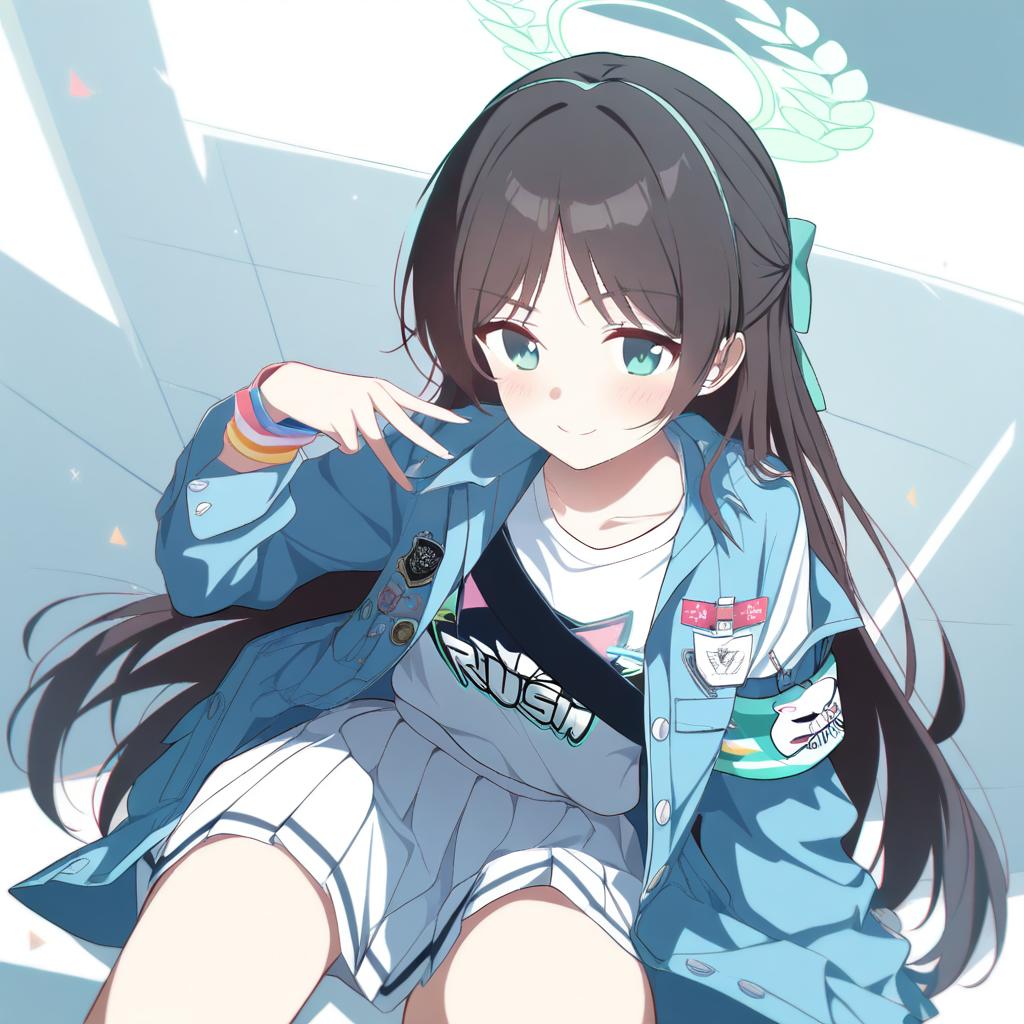 Airi (band) (blue archive), blue archive, 1girl, green eyes, long hair, black hair, brown hair, white shirt, white skirt, pleated skirt, blue jacket, open jacket, halo, green halo, long sleeves, by artist chamchami, anime