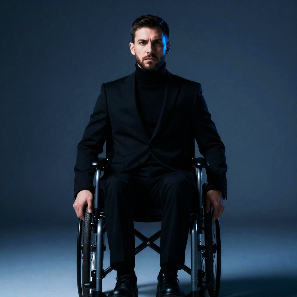 Photograph of a man in a black turtleneck and suit, sitting on a wheelchair, centered against a smoky blue background. He has a stern expression, short dark hair, and a beard. Blue light illuminates his face from behind.