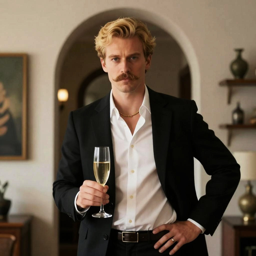 Blonde man with mustache, white shirt, black jacket, gold necklace, holding champagne glass, standing in dimly lit room, hand on hip, serious expression. Background: arched doorway, wall art, shelves, lamp. Indoor setting.
