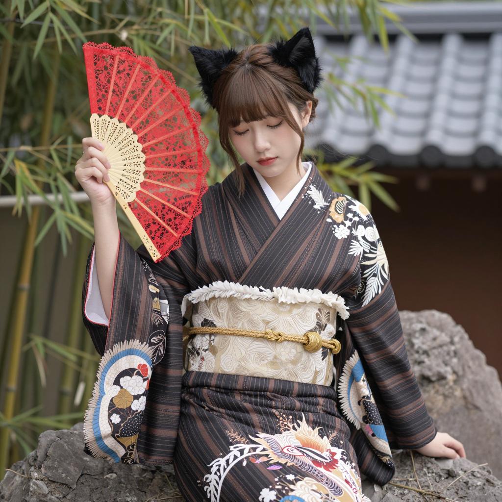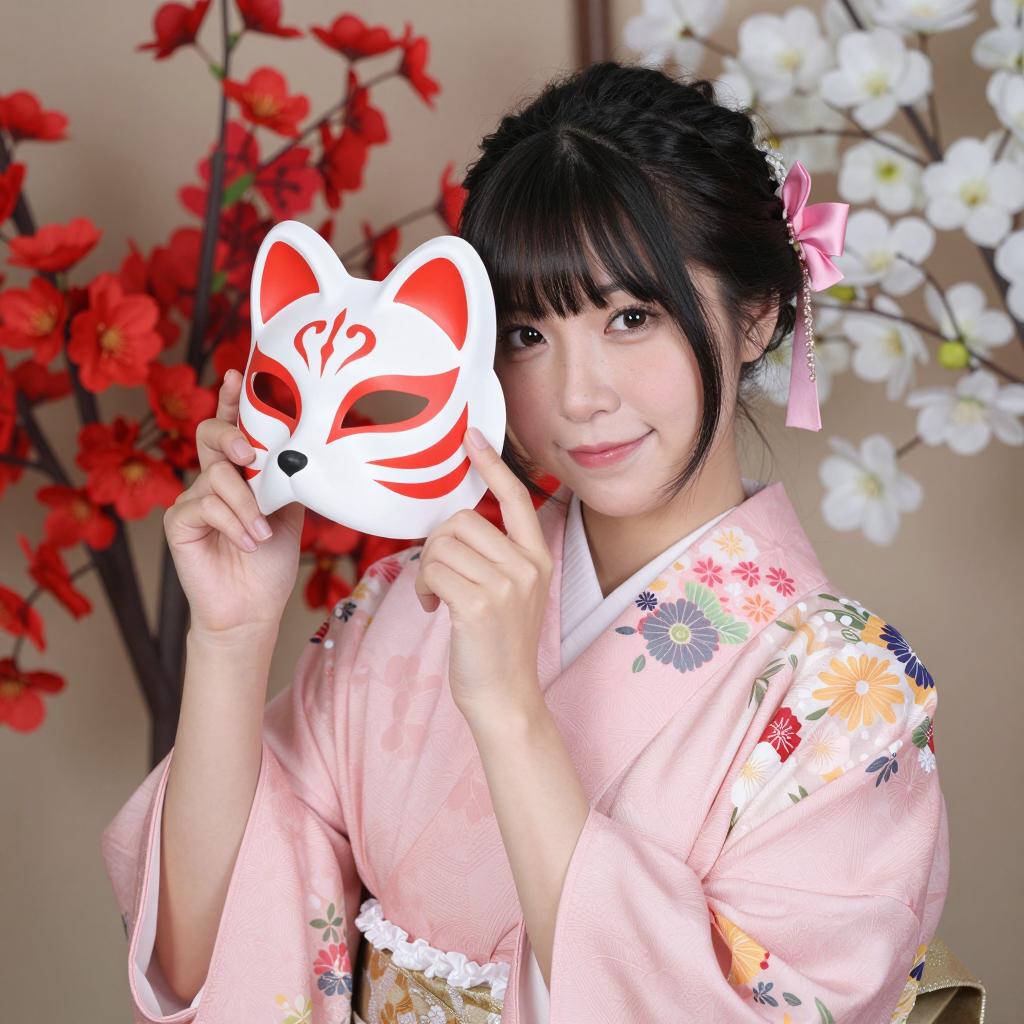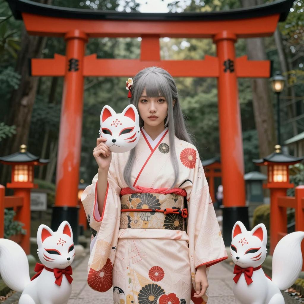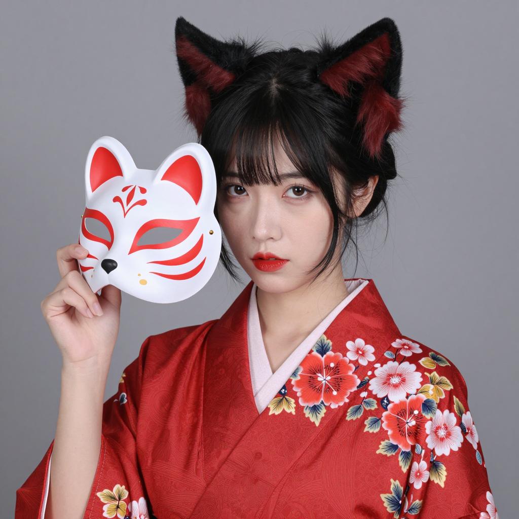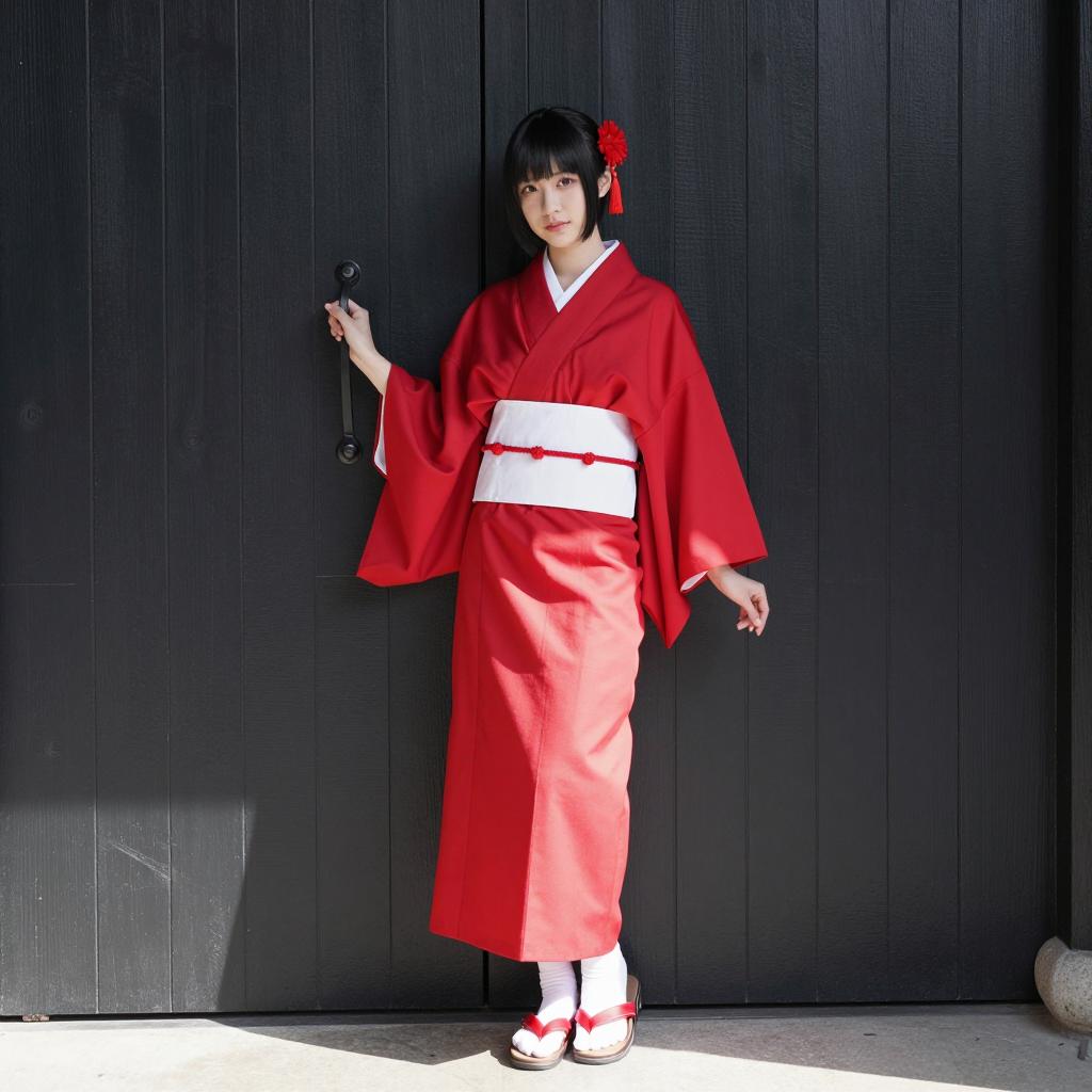 Asian woman in red floral kimono with fox ears and tail, holding red paper umbrella, standing on one leg under arch. Green foliage and stone background. Black shoes with red laces. Fox tail sways to the left. Bright sunlight. Real photo.