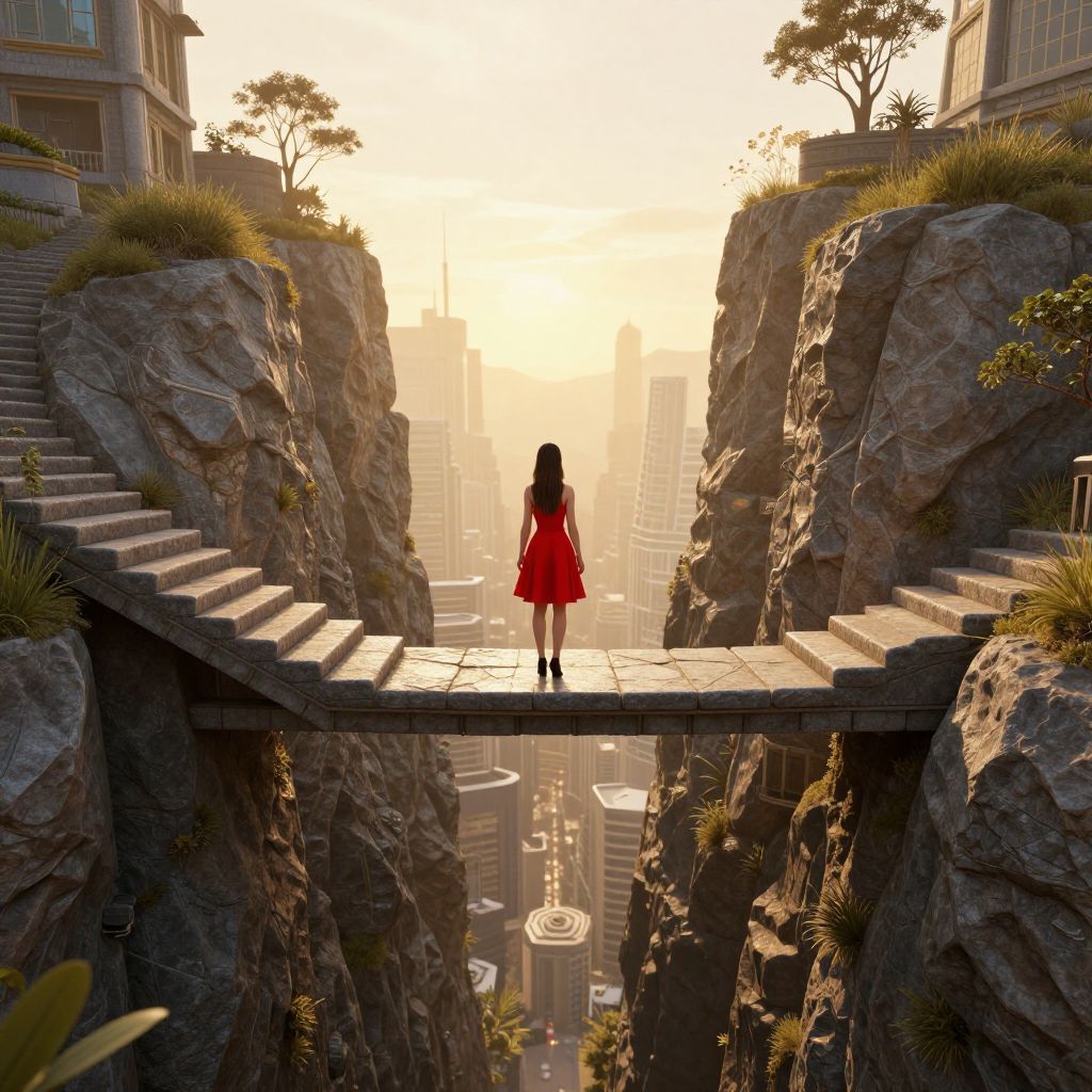 A surreal 3D-rendered scene depicts a woman in a vibrant red dress standing at the edge of a narrow, stone staircase that bridges two towering cliffs, leading toward a distant cityscape illuminated by ethereal golden-hour light, evoking a dreamlike, cyberpunk-inspired atmosphere where architecture and nature merge seamlessly.