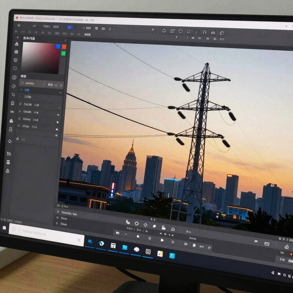 How to remove power lines from a photo, focusing on before and after shots of a landscape with mountains and clear skies, photo editing interface visible with cloned background replacing power lines, vibrant colors, sharp detail, professional photography editing tutorial vibe
