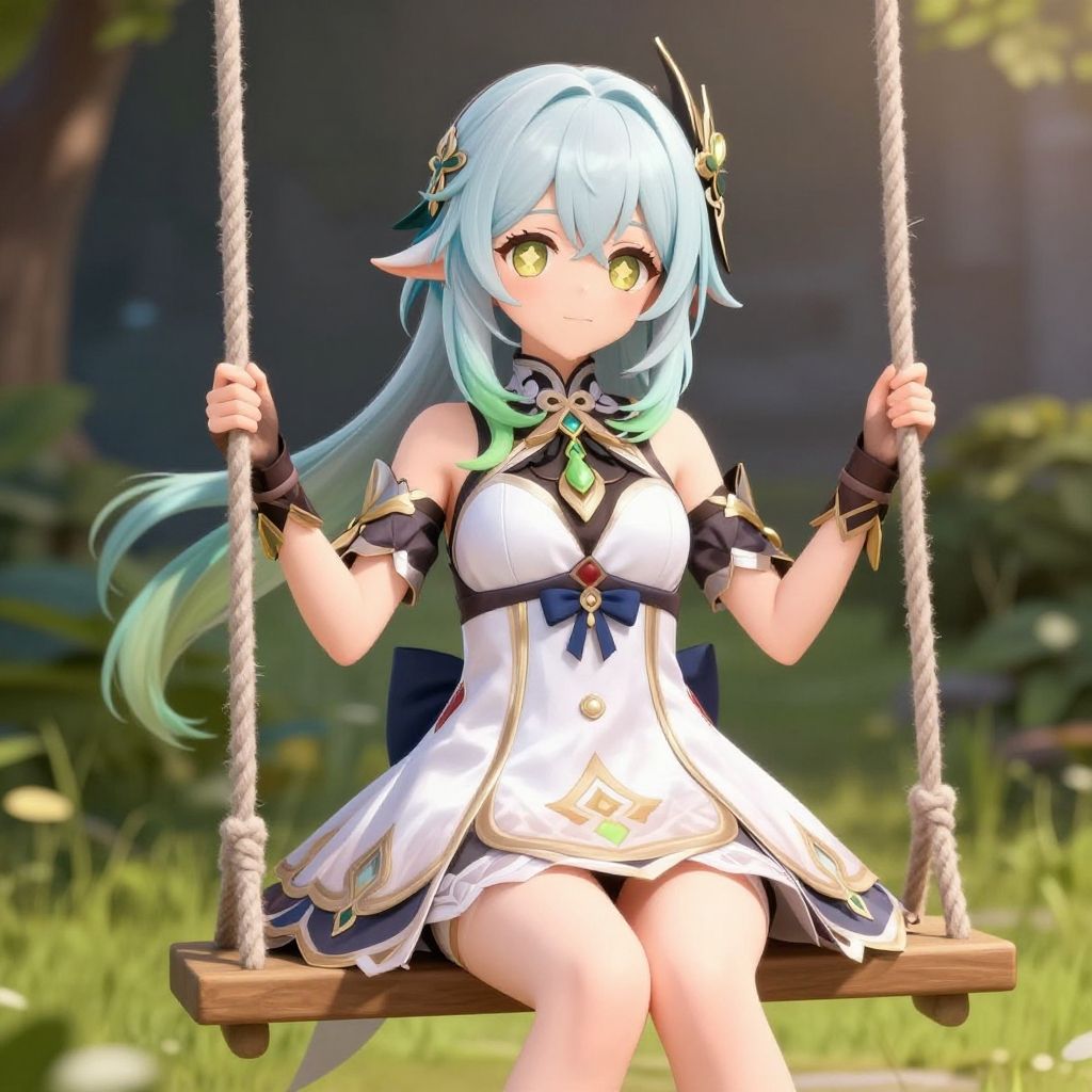 Masterpiece, best quality, 1girl, solo, nahida_genshin, (cross-shaped pupils:1.2), default_dress, (swing:1.2), sitting
