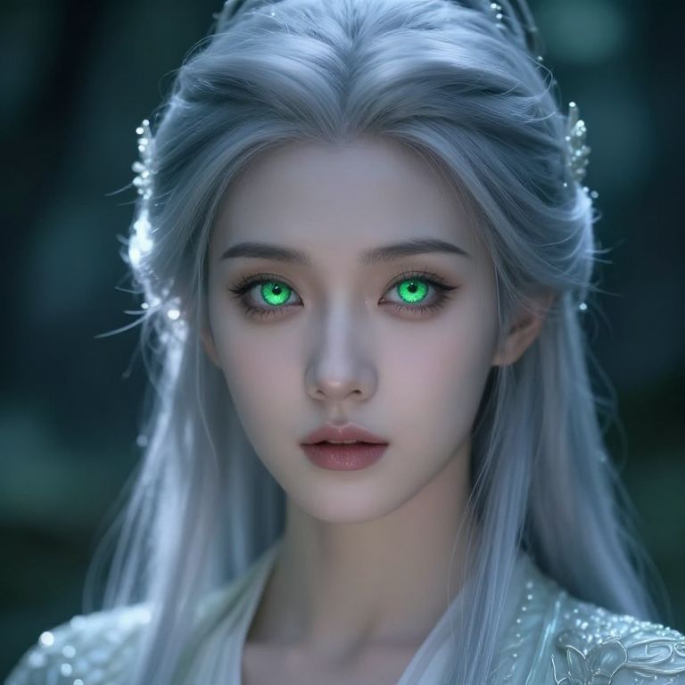 Silver hair green eyes glowing in moonlight, ethereal fantasy portrait, intricate details, soft focus, magical forest background, high resolution, cinematic lighting