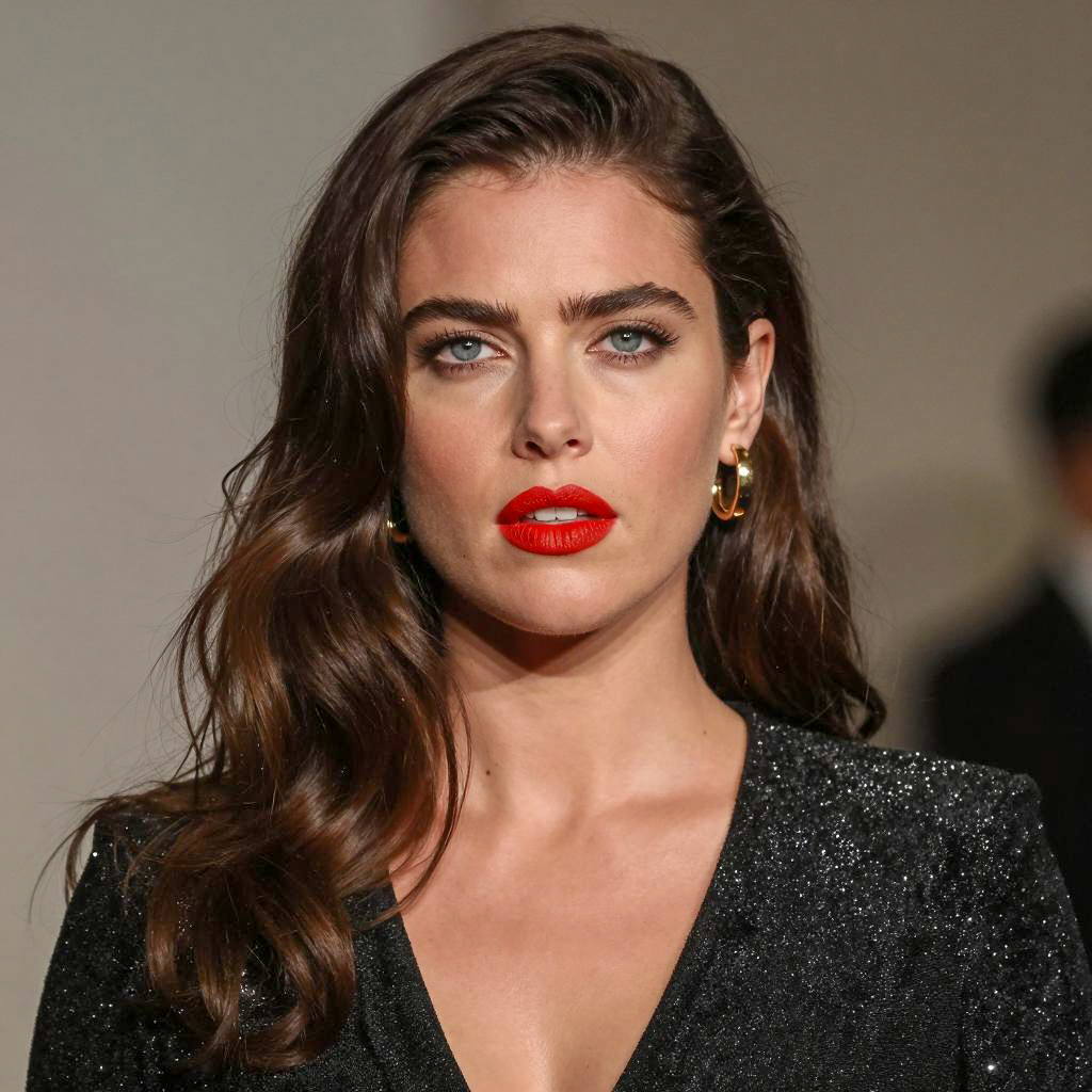 Two women standing side by side. Woman on left has long brown hair, light skin, and wears a silver patterned vest over a white shirt. Woman on right has dark brown hair in a high ponytail, light skin, and wears a black sheer dress with lace trim, exposing her breasts. Background has blurred people and blue-patterned wall. Both women look to the right.