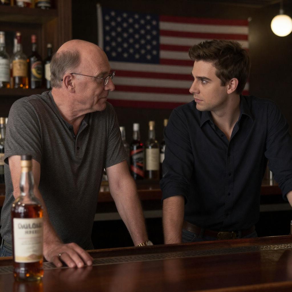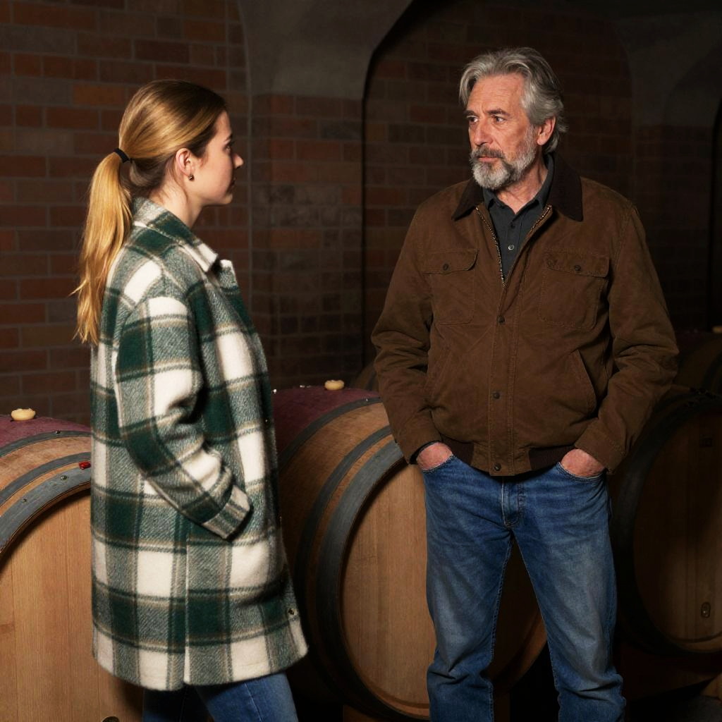 Photograph of two men in dark clothing, crouching on a wooden floor in a dimly lit warehouse. One man, with short dark hair, reaches towards a black box while the other, with a beard, looks on. Large wooden barrels and industrial equipment are in the background.