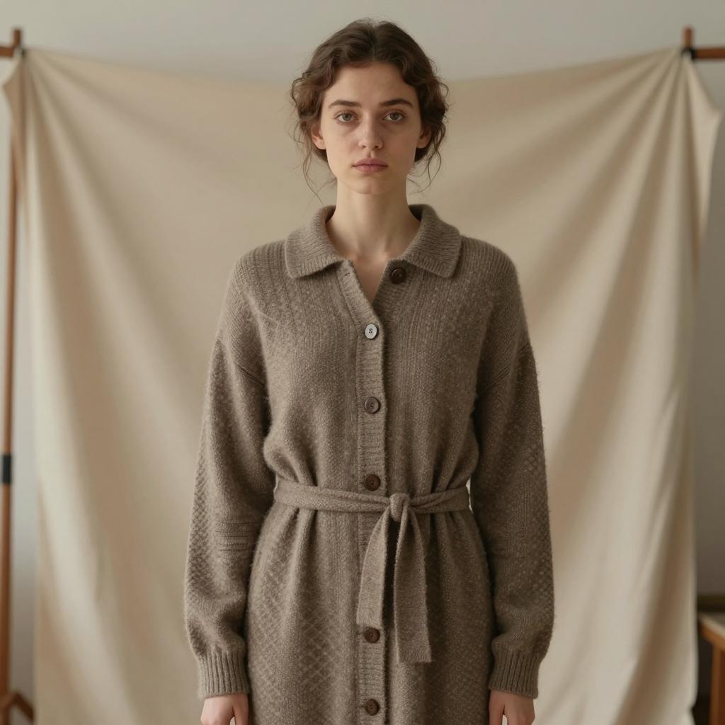 Woolen gown woman, photograph of a young woman, standing indoors, wearing a brown patterned knit dress with buttons, tied at the waist, natural light, serious expression, brown hair in a loose updo, light skin, background with beige draped fabric and wooden frame, realistic style, cinematic lighting, subtle shadows, cozy atmosphere, slight focus on her face, warm color palette