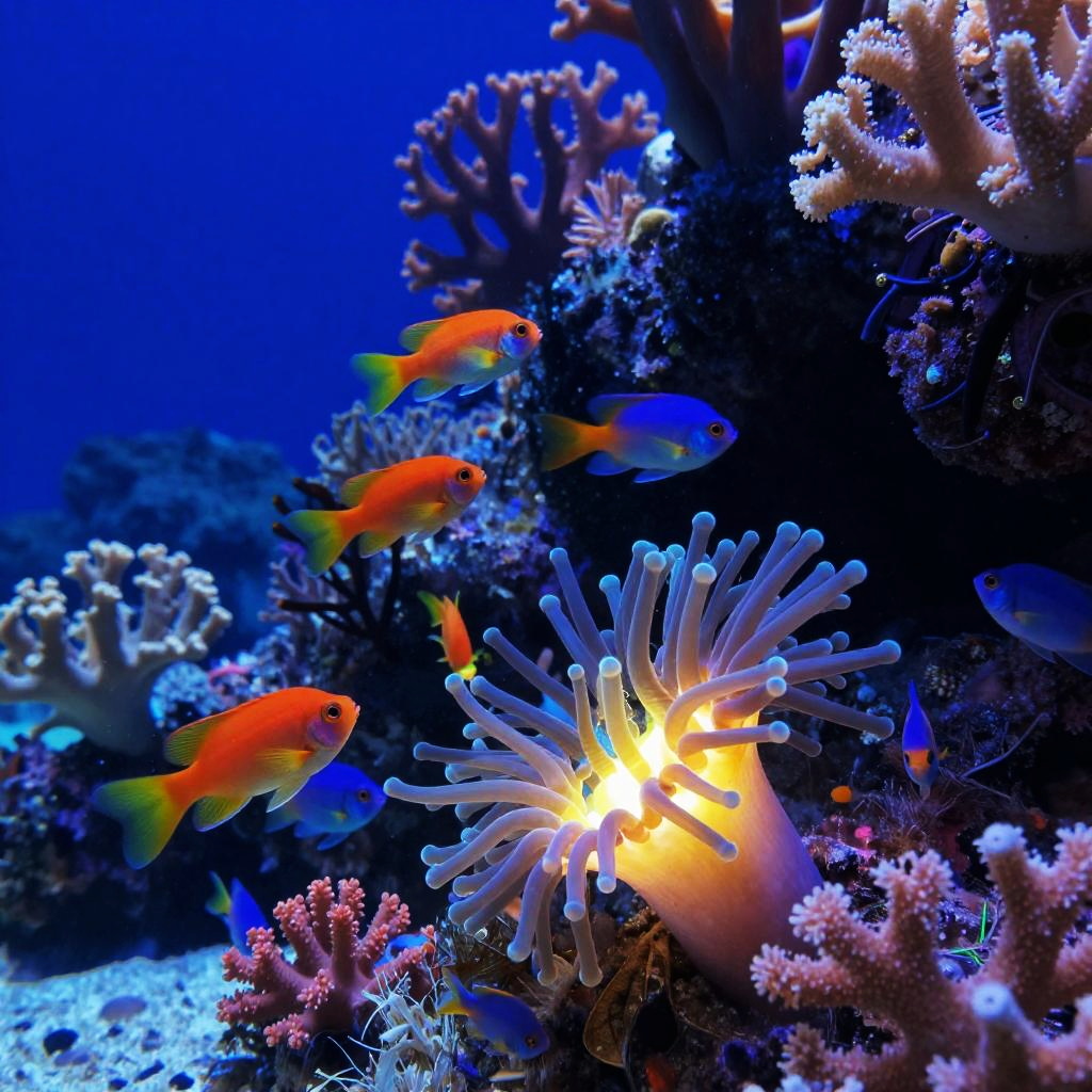 Fantasy scene featuring a twilight coral reef with fluorescent fish, glowing sea anemones, magical atmosphere, highly detailed.