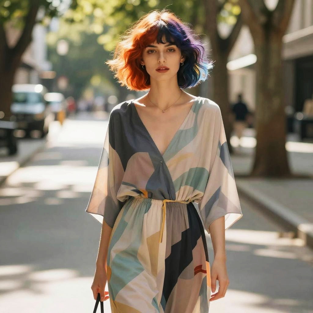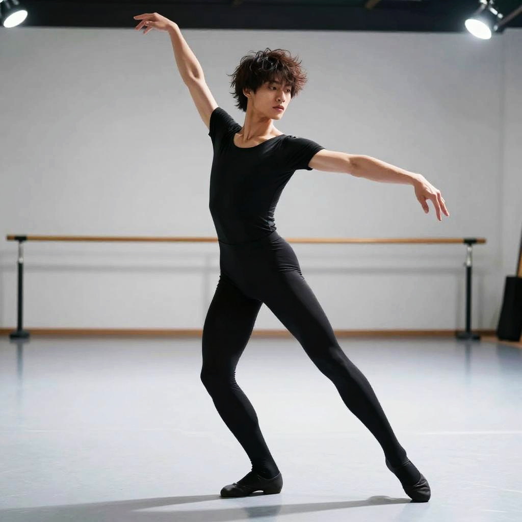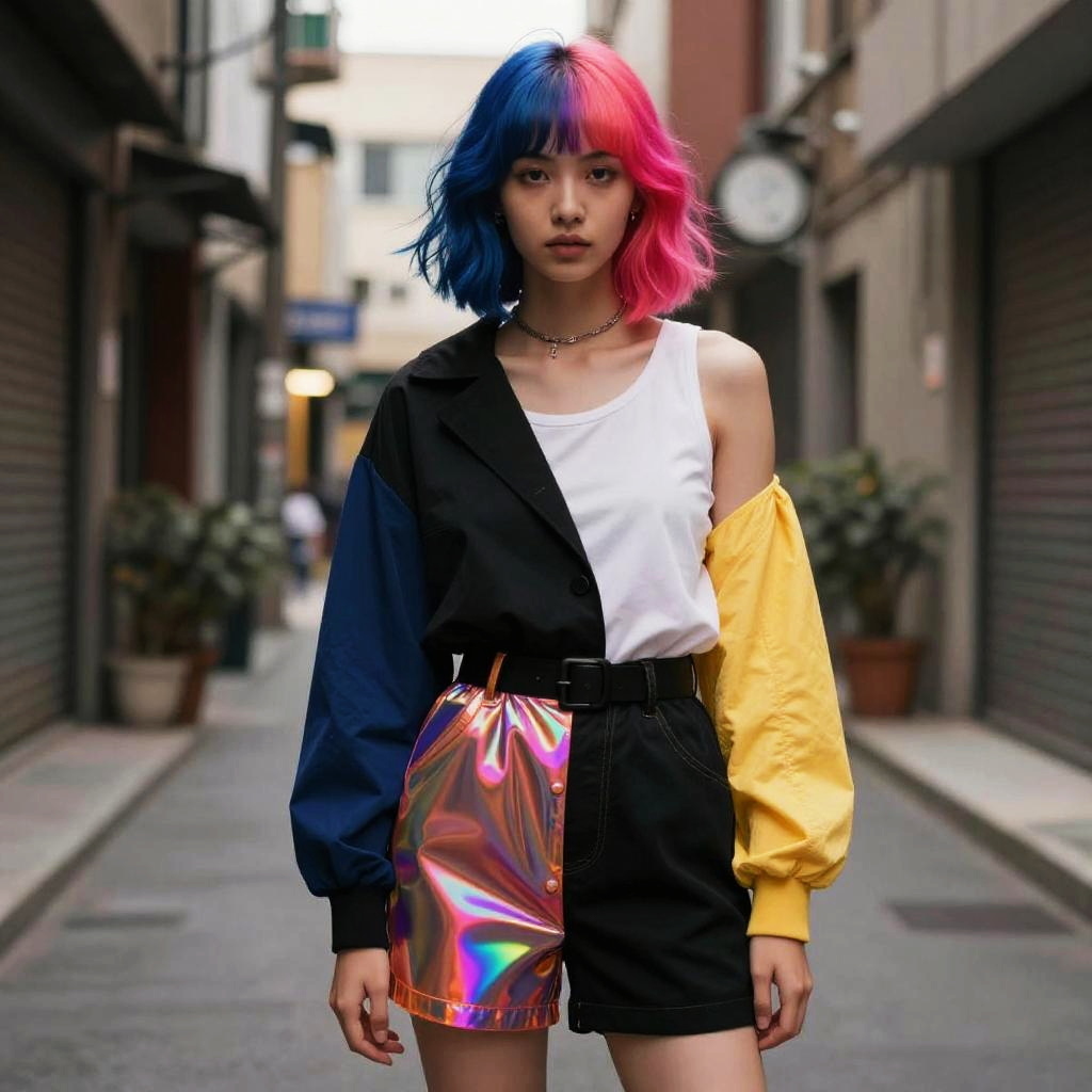 Color Blocking hairstyle on male dancer, wearing graphic leotard and tights, in urban alley, captured in fashion editorial style with neon reflection.
