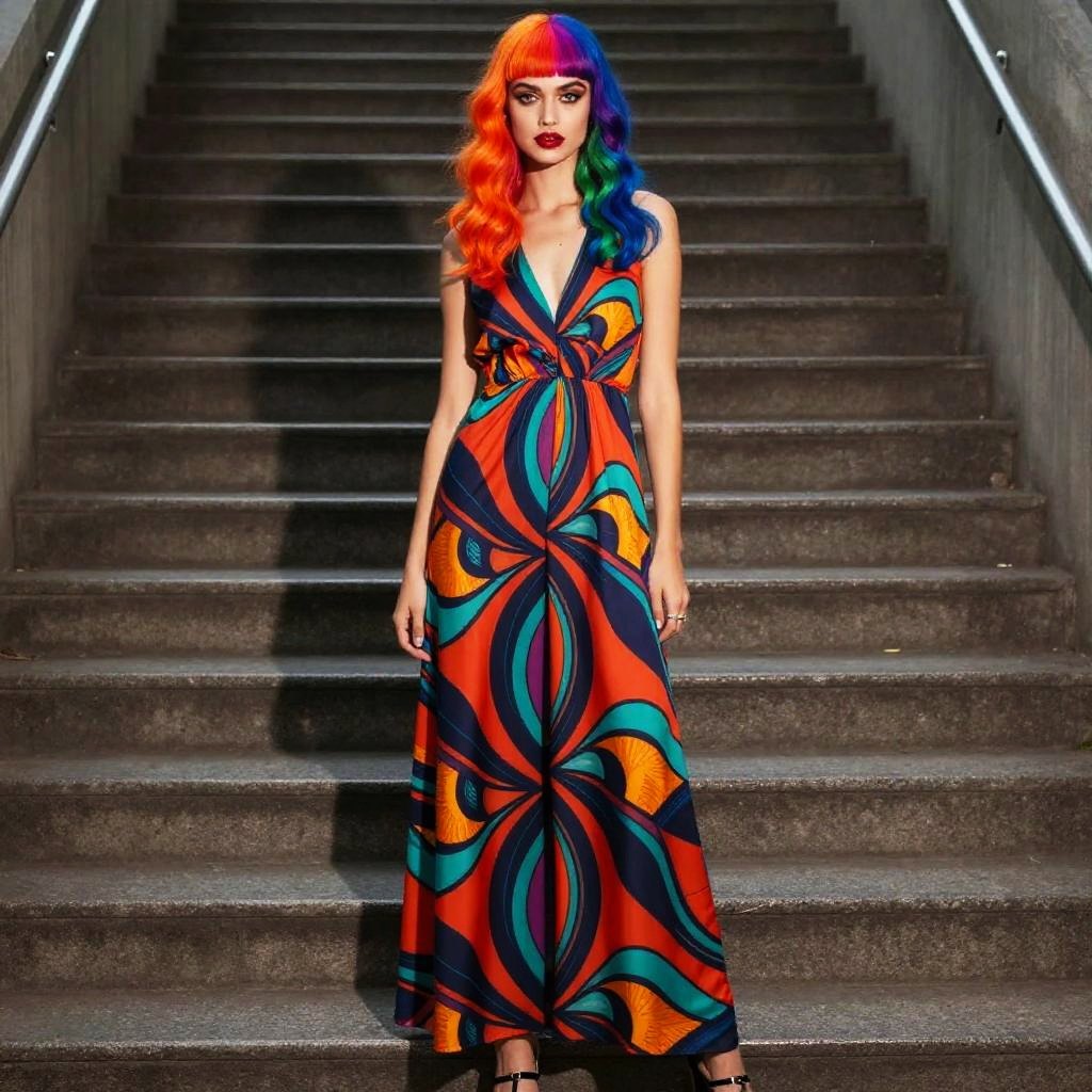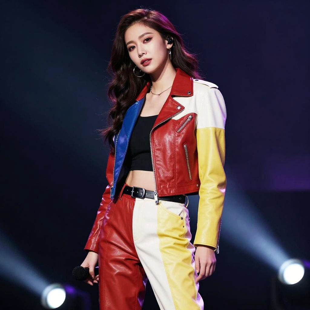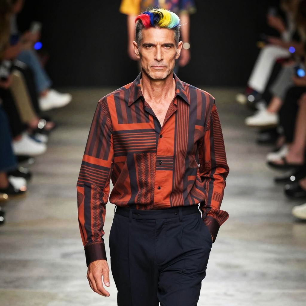 Color Blocking hairstyle on male dancer, wearing graphic leotard and tights, in urban alley, captured in fashion editorial style with neon reflection.
