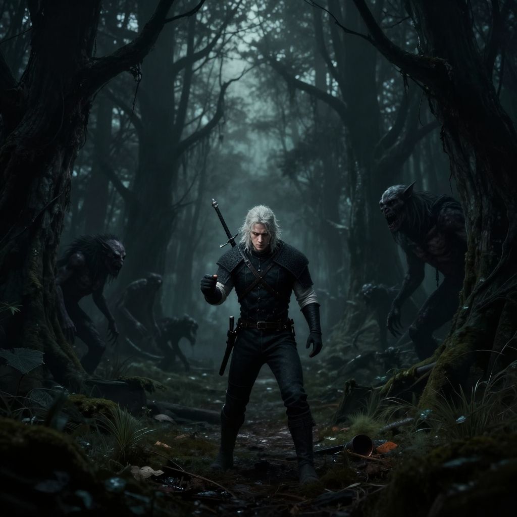 Dark forest scene: silver-haired man in black gear, sword, and pistol stands defiantly, three shadowy, menacing creatures lurking behind. Photoreal